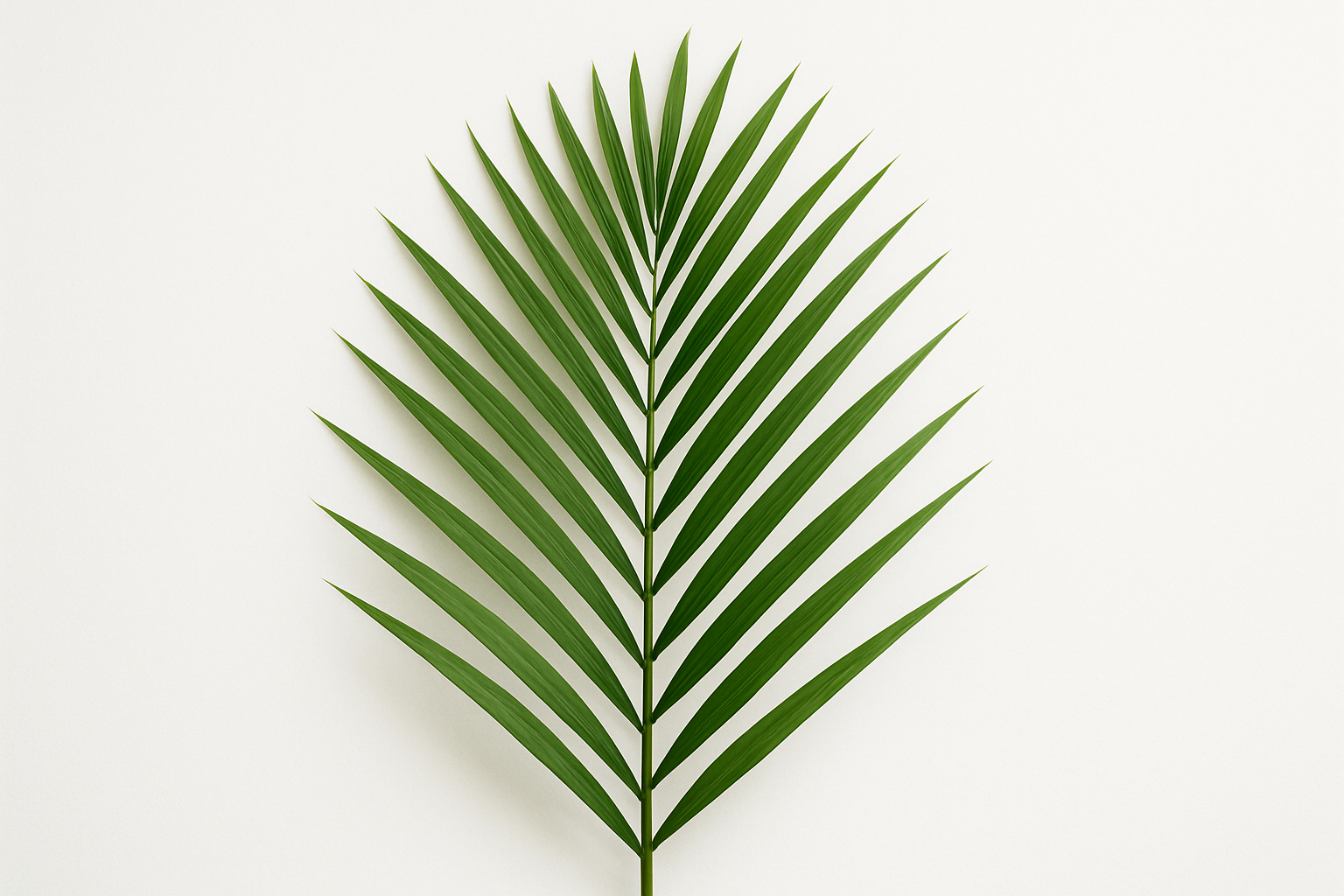 На изображении представлен большой лист пальмы, расположенный на белом фоне. Лист имеет ярко-зеленый цвет и четко видимые прожилки, что придает ему красивую текстуру и форму. Пальмовые листья известны своим тропическим видом и часто ассоциируются с экзотической природой. Фотография выполнена в минималистичном стиле, где внимание сосредоточено на природном элементе. Лист пальмы занимает центральное место на изображении, создавая контраст с нейтральным фоном, что делает его особенно выразительным.