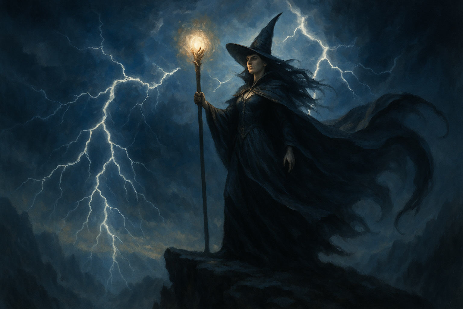 На изображении представлена таинственная ведьма, облаченная в черный плащ, стоящая на высоком обрыве. Ее длинные волосы развеваются на ветру, а в руках она держит посох с светящимся шаром на кончике. Фон состоит из мрачных бурых облаков, где сверкают молнии, добавляя напряжение к сцене. Элемент ночного небосвода, заполненный яркими вспышками электричества, создает атмосферу магии и загадки. Эта композиция излучает силу и уверенность, демонстрируя ведьму как могущественное существо.