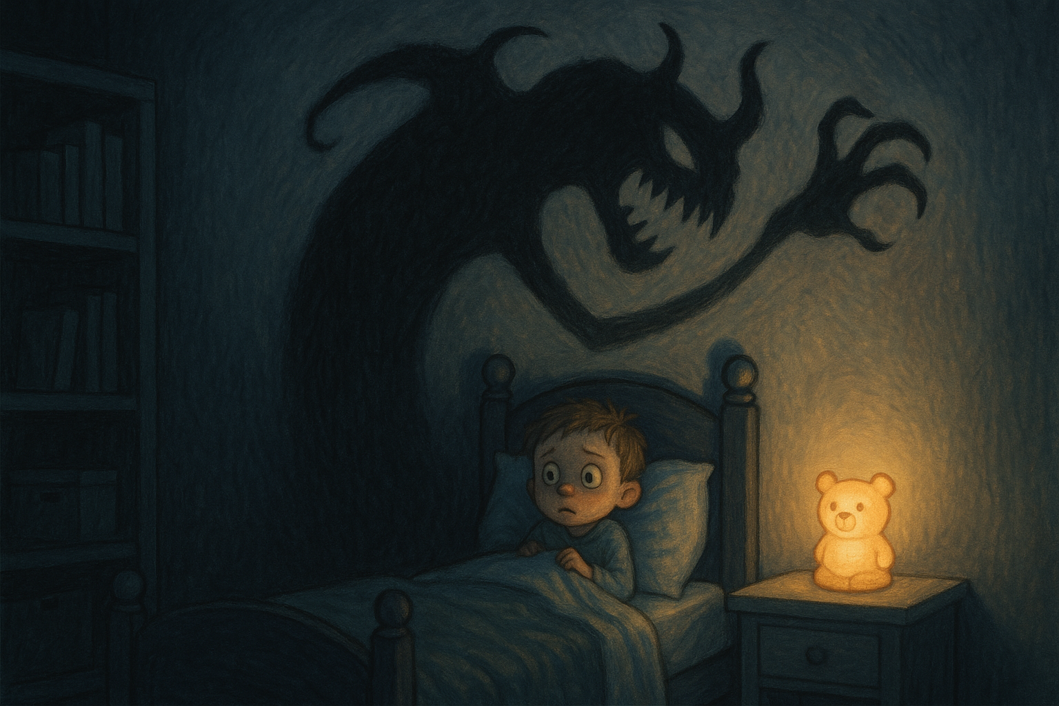 На изображении мы видим испуганного мальчика, сидящего в своей кровати в темной комнате. Он смотрит на стену, где проецируется зловещая тень монстра с острыми когтями и грозным лицом. В комнате есть небольшая настольная лампа, излучающая теплый свет, а рядом с ней стоит плюшевый медвежонок. Комната наполнена элементами, отражающими детскую атмосферу, такие как шкаф с книгами и разрушительными тенями, которые создают ощущение неуютности. Мальчик одет в пижаму и выглядит явно встревоженным.