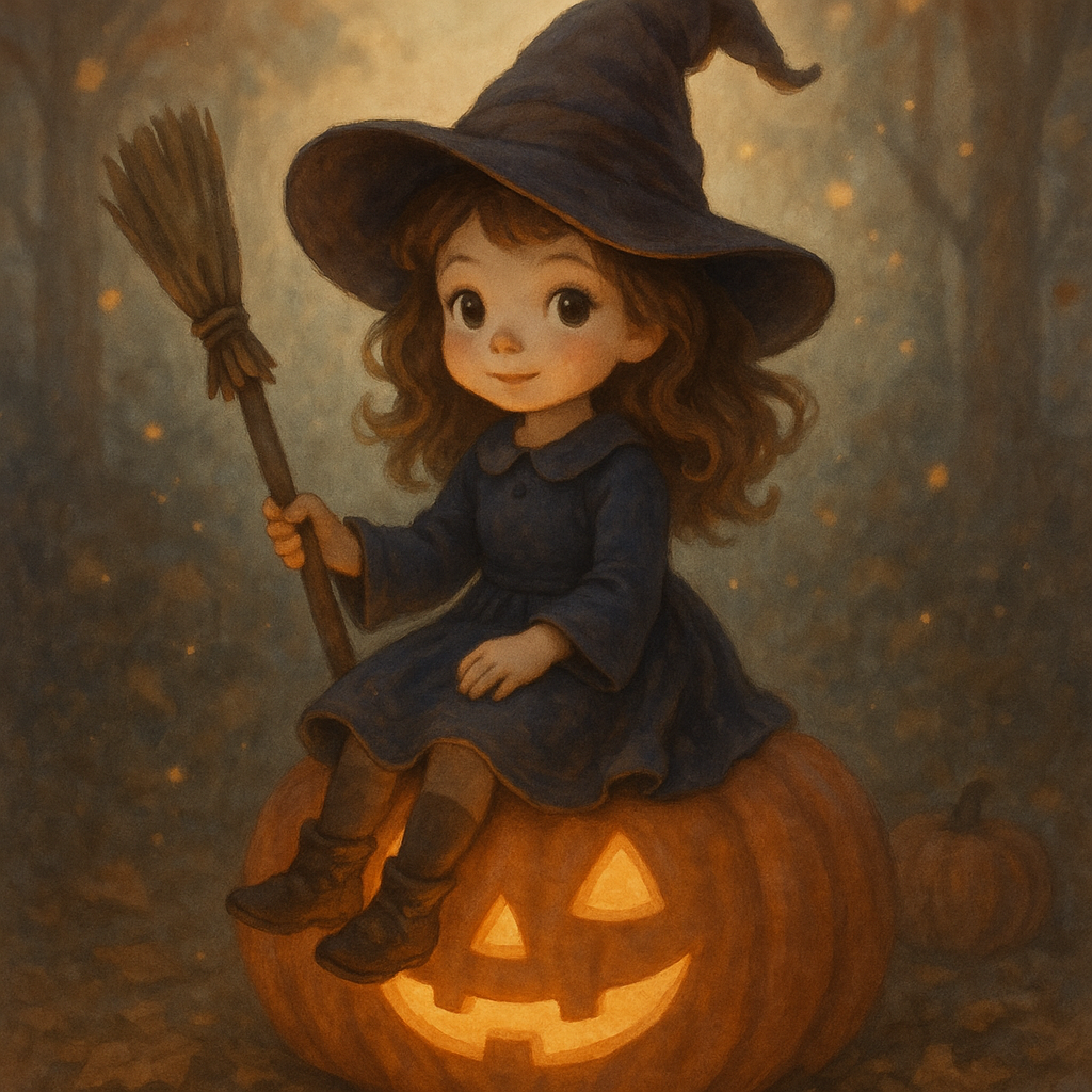 На изображении изображена маленькая девочка, одетая в костюм ведьмы, сидящая на большой тыкве. У неё длинные каштановые волосы и она носит тёмно-синюю одежду с воротником. В руках она держит метлу, а на фоне виден осенний лес с размытыми очертаниями деревьев. Тыква имеет улыбающееся лицо, что придаёт сцене игривый и волшебный вид. Свет, проникающий сквозь лес, создаёт теплое и уютное настроение в изображении.
