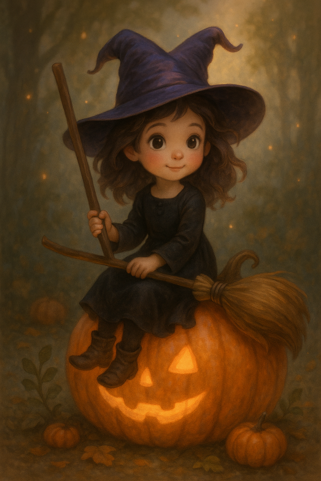 На изображении мы видим милую девочку, одетую в черное платье, сидящую на большой тыкве. Она носит темно-синюю шляпу ведьмы и держит в руках волшебную палочку. Девочка выглядит игриво и счастливо, с доброй улыбкой и большими сияющими глазами. На фоне картина наполнена туманом и мягким светом, создающим волшебную атмосферу осеннего леса. Вокруг нее расположены несколько маленьких тыков, а на одной из них вырезана улыбающаяся физиономия, что добавляет игривого настроения к общему впечатлению.