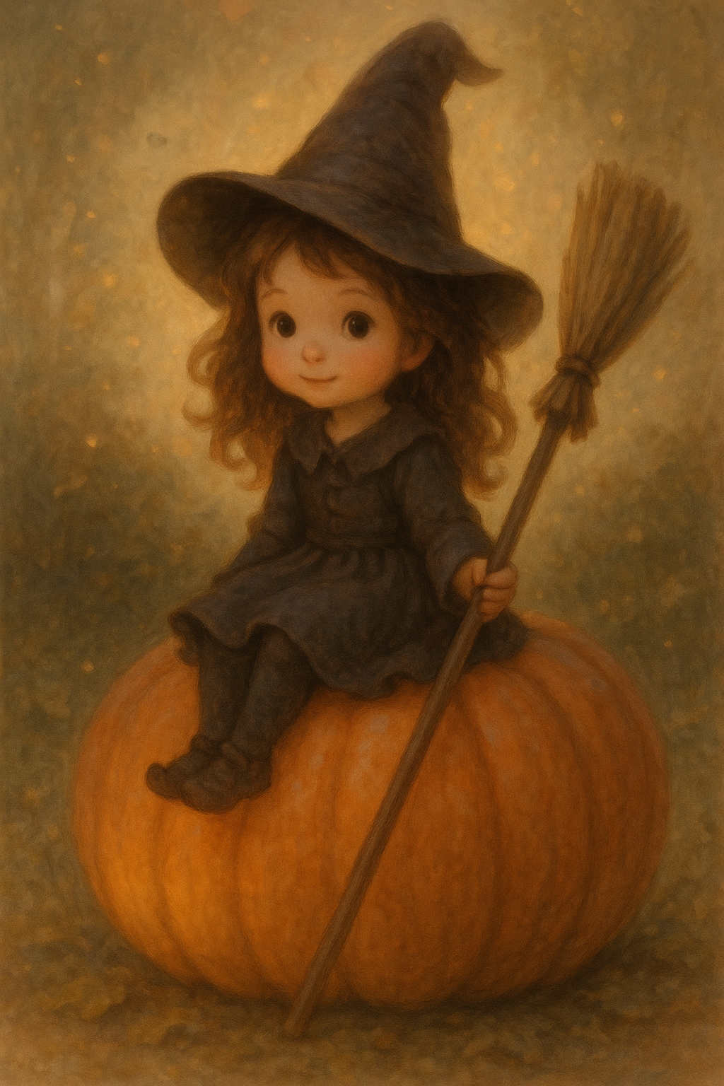 На изображении изображена маленькая девочка в черной одежде и шляпе-ведьме, сидящая на крупной оранжевой тыкве. У неё длинные волнистые волосы, она улыбается, держит в руках метлу, а вокруг неё мягкий свет, создающий атмосферу волшебства. Фон выполнен в теплых тонах с золотистыми акцентами, что придаёт картине сказочное настроение и ощущение приближающегося праздника, возможно, Хэллоуина. Такой стиль иллюстрации напоминает детские книги или анимационные фильмы, подчеркивая не только визуальную привлекательность, но и содержание, наполненное магией и чудесами. Тыква, на которой сидит девочка, очень крупная и детализированная, что акцентирует внимание на её центровой роли в изображении.