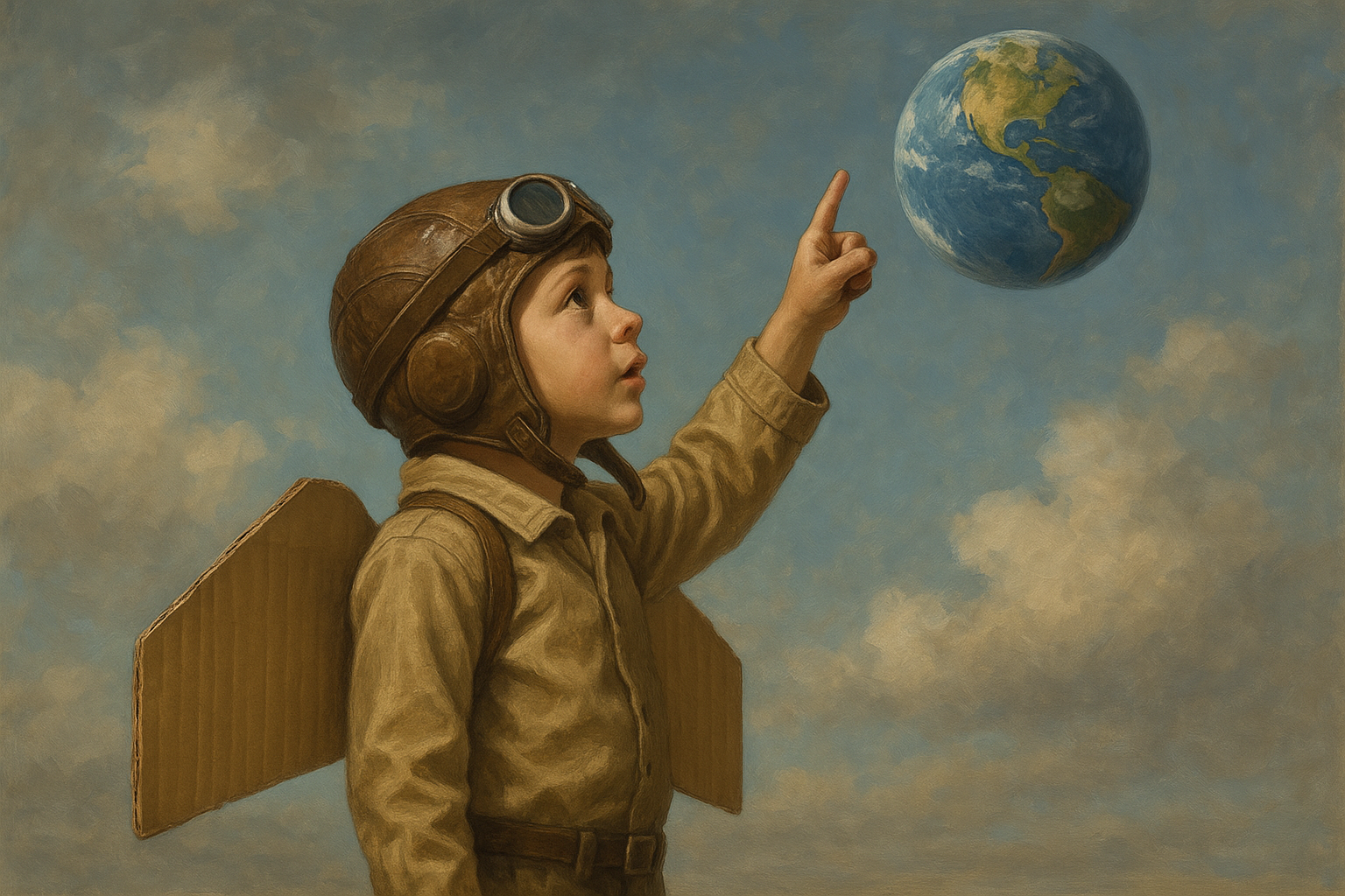 На изображении запечатлен мальчик, одетый в авиационный шлем и куртку, с картонными крыльями за спиной. Он, с широко открытыми глазами, указывает на мир, который находится в воздухе над ним. Голубое небо с белыми облаками создает легкую и радостную атмосферу, передавая дух детской мечты о полетах. Ребенок выглядит полным надежд и любопытства, словно мечтает о путешествиях и открытиях.
