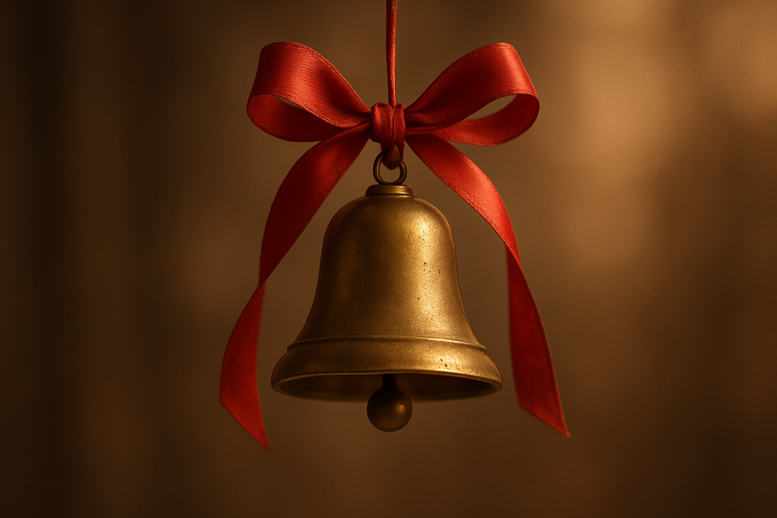 На изображении представлен медный колокол, подвешенный на красной ленте. Колокол имеет округлую форму и блестящую поверхность, отражающую свет. Рядом с ним расположена яркая красная ленточка, завязанная в красивый бантик. Фон изображения размыт, что создает теплую атмосферу и подчеркивает детали самого колокола и банта. Это сочетание элементов создаёт уютное и праздничное настроение, идеально подходящее для зимних праздников или новогодних мероприятий.