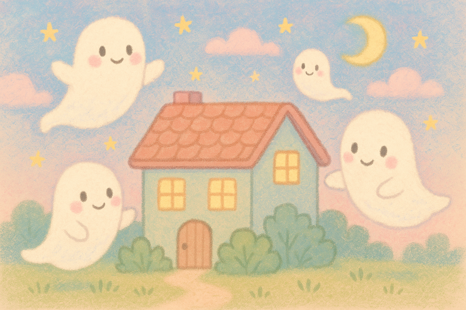 На изображении изображены милые привидения, которые летают вокруг небольшого уютного дома. Этот дом утопает в зелени кустов, а на фоне виднеется звёздное ночное небо с облаками и полумесяцем. Каждое привидение имеет улыбающееся лицо, создавая дружелюбную атмосферу. Крыша дома покрыта плиткой, а окна светятся тёплым светом, придавая сцене ощущение уюта. Вся композиция выполнена в мягких пастельных тонах, что добавляет картине лёгкости и мечтательности.