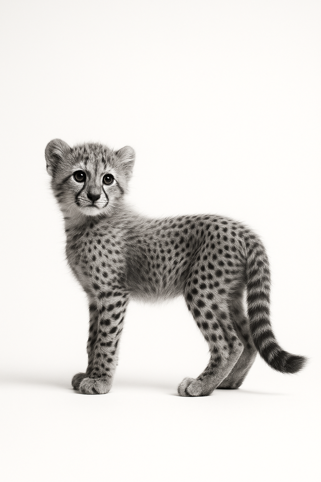 На изображении представлен маленький гепард, совершающий шаг в правую сторону. Его шершавая шерсть покрыта характерными черными пятнами, которые расположены по всему телу, придавая ему характерный вид. У гепарда большие выразительные глаза и мягкие ушки, которые дополняют его миловидный облик. Фон изображения белый, что создает акцент на гепарденке и подчеркивает его грациозные формы. Однако общая цветовая палитра остаётся в пределах серых и черных тонов, создавая эффект минимализма и элегантности.