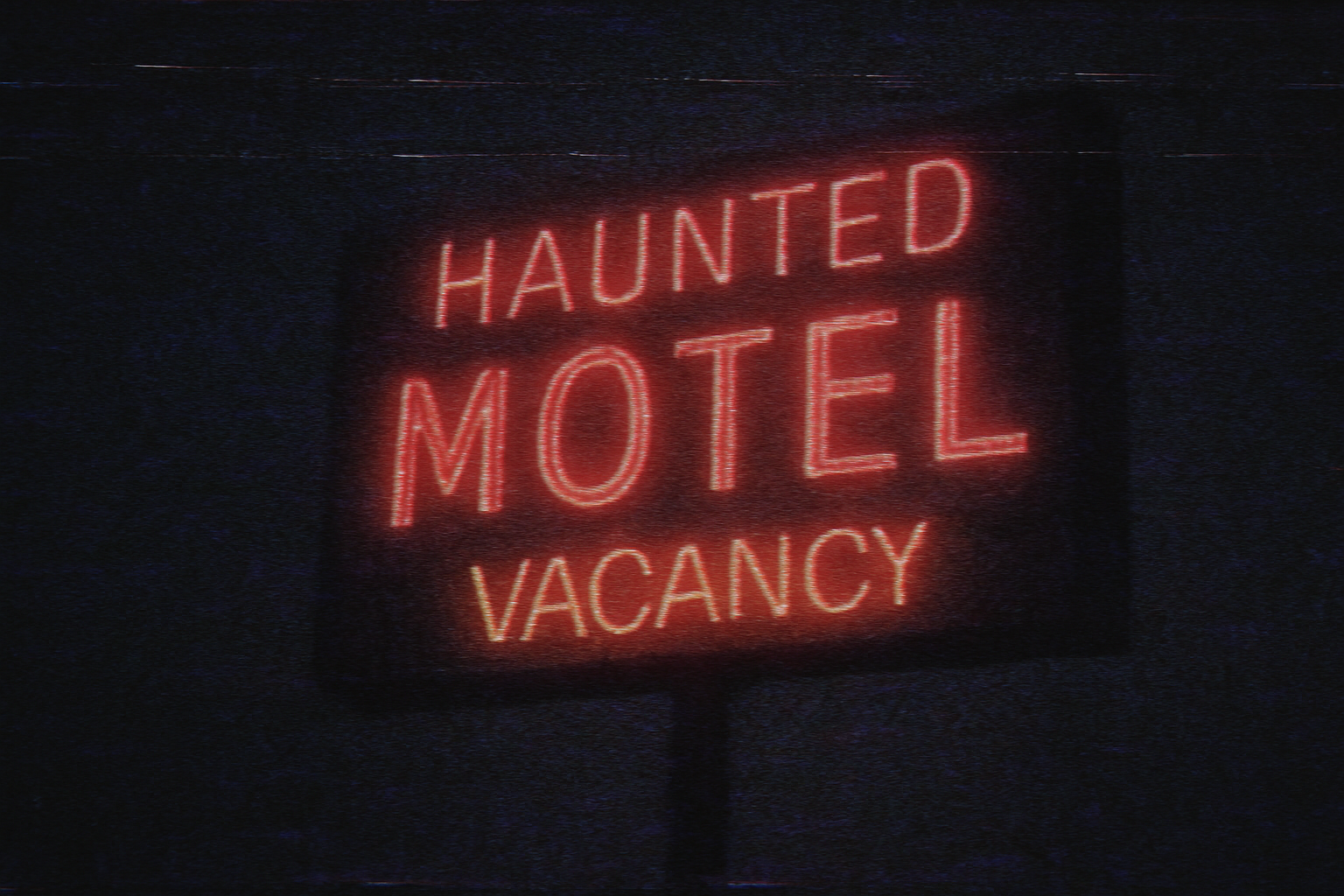 На изображении представлена неоновая вывеска заброшенного мотеля, которая светится ярким красным цветом на фоне темного ночного неба. Написание "HAUNTED MOTEL" выполнено крупными буквами, что делает его заметным даже издалека. Слово "VACANCY" указывает на наличие свободных мест. Такое оформление и яркое освещение создают атмосферу загадки и интриги. Здесь присутствует элемент ретро, что добавляет дополнительный шарм. Вывеска выглядит немного потертой, как будто долгое время не использовалась. Это придает ей мистический и даже немного пугающий вид. Неоновый свет бросает мягкие тени вокруг, создавая интересный контраст между темнотой и ярким светом вывески.