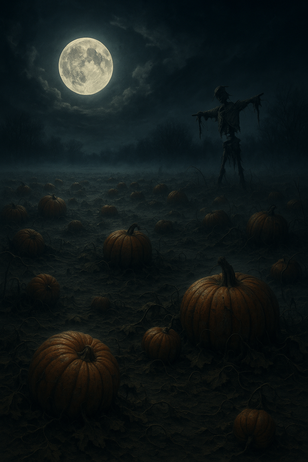 На изображении представлена загадочная ночная сцена, где в центре композиции находятся тыквы, разбросанные по темному полю. Полная луна освещает этот пейзаж, создавая атмосферу таинственности. Лунный свет отражается на гладкой поверхности тыкв, выделяя их оранжевые оттенки. На фоне виден силуэт пугала, которое стоит вдалеке, добавляя элемент страха и загара. Небо затянуто облаками, что придает картине драматичный вид, а низкие туманы над землей усиливают чувство глубокой ночи. В окружении тыкв можно заметить побеги и засохшую листву, что делает картину еще более реалистичной и оливковой.