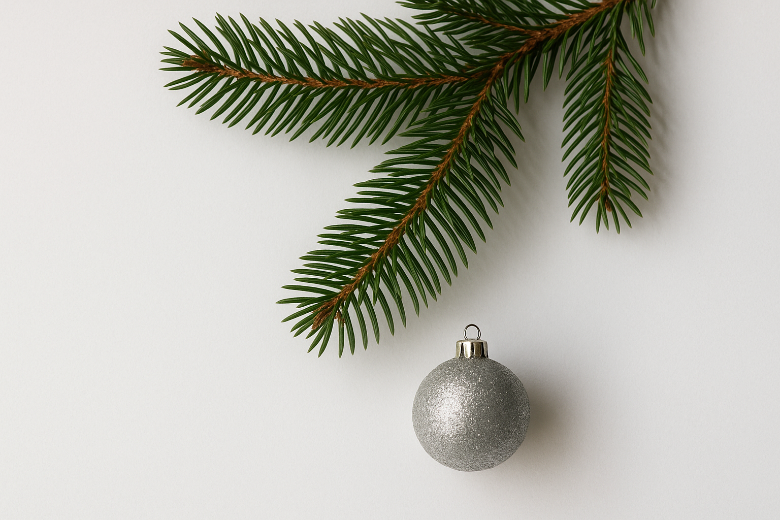 Еловая ветка и серебристая новогодняя игрушка на белом фоне