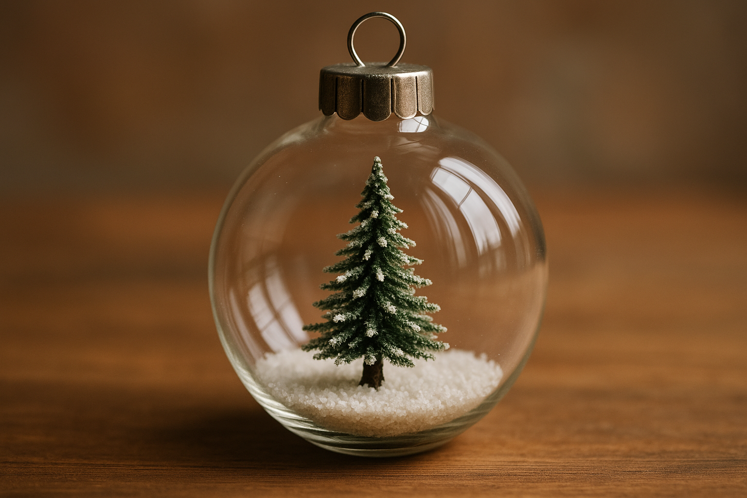 На изображении представлен стеклянный шар, внутри которого находится миниатюрная елка, окруженная искусственным снегом. Елка имеет насыщенный зеленый цвет и выполнена с высокой детализацией, придающей ей естественный вид. Основной фон имеет мягкие теплые тона, что создает уютную атмосферу. Стеклянный шар имеет металлическую крышку с рифлеными краями, придающую ему дополнительный шарм.