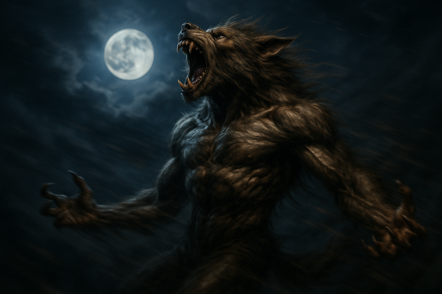 На изображении предстает впечатляющий волк-оборотень, демонстрирующий свою силу и мощь. Он возвышается, зарычав, с раскрытой пастью и острыми клыками. Его густая шерсть покрывает мощное мускулистое тело, выделяясь на фоне темного небосвода. Полная луна освещает сцену, создавая контраст между ярким светом и тенями, что придает образы особую атмосферу. Фон изображен с размытыми облаками, которые усиливают ощущение динамизма и напряжения. Этот образ может отобразить мифические или фэнтезийные аспекты, а также подчеркивает элементы сказочности и ужасов.