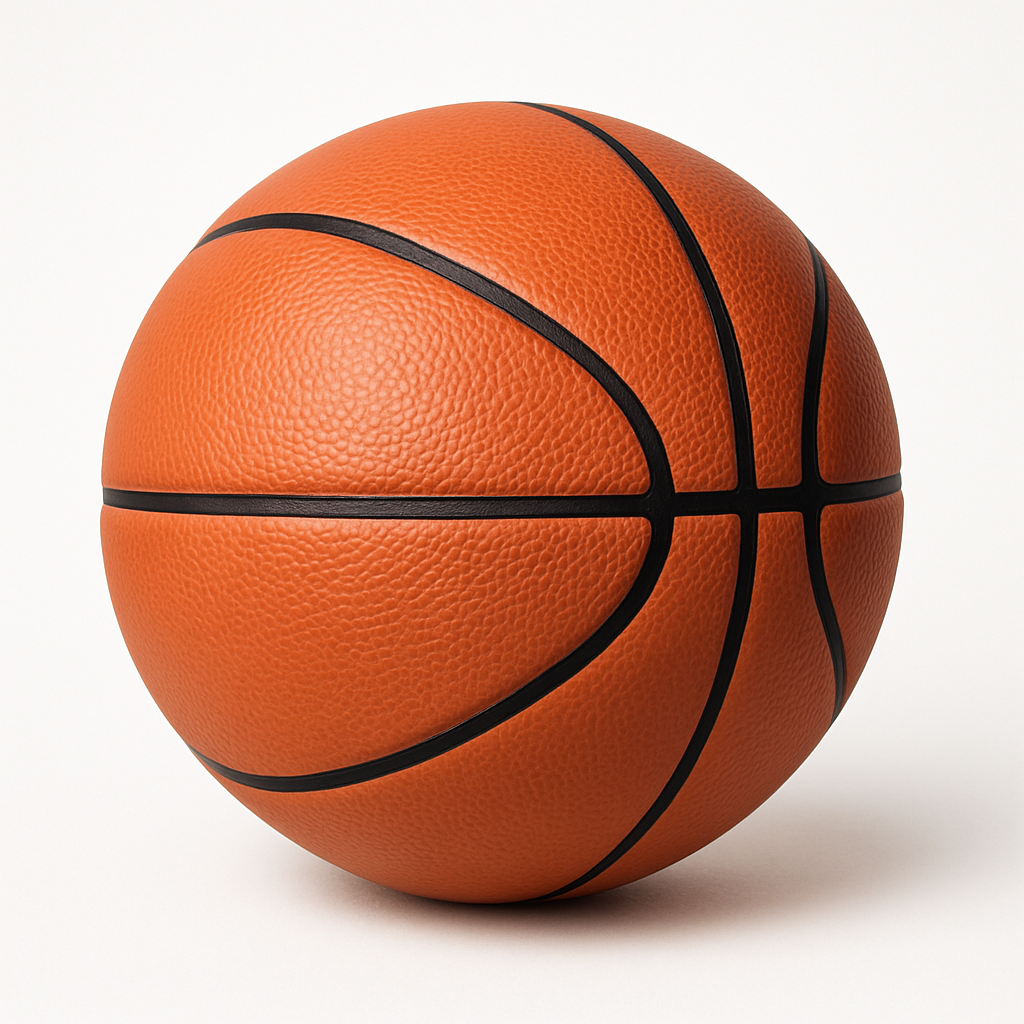 На изображении представлен оранжевый баскетбольный мяч, выполненный из высококачественного материала с характерной текстурой. Четкие черные линии, разделяющие поверхность мяча на сегменты, подчеркивают его форму и делают дизайн более выразительным. Мяч установлен на белом фоне, что позволяет акцентировать внимание на его форме и деталях. Благодаря четкой фокусировке можно рассмотреть поверхности мяча, его текстуру и особенности.