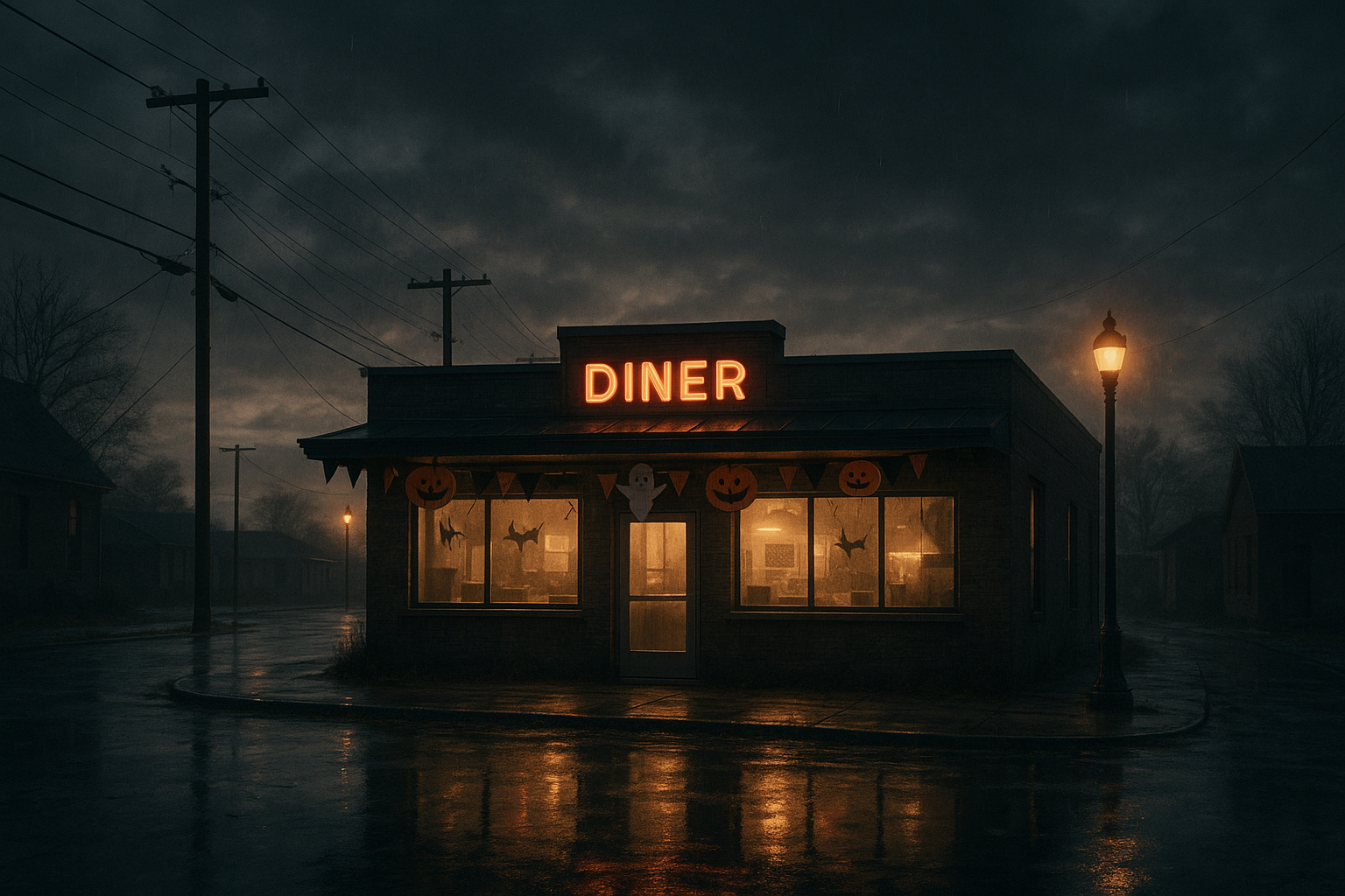 На изображении мы видим закусочную, расположенную на пустынной улице в тёмное время суток. Вывеска в виде неонового слова «DINER» ярко освещает фасад заведения на фоне мрачного и облачного неба. На окнах закусочной висят элементы декора, связанные с Хэллоуином, такие как тыквы и призрак, что придаёт сцене атмосферу осеннего праздника. Свет ламп на улице отражается на мокрой от дождя дорожной поверхности, создавая ощущение зимней прохлады и тишины вокруг. Деревья и линии электропередач добавляют детали в пейзаж, усиливая ощущение заброшенности и запустения данного места.