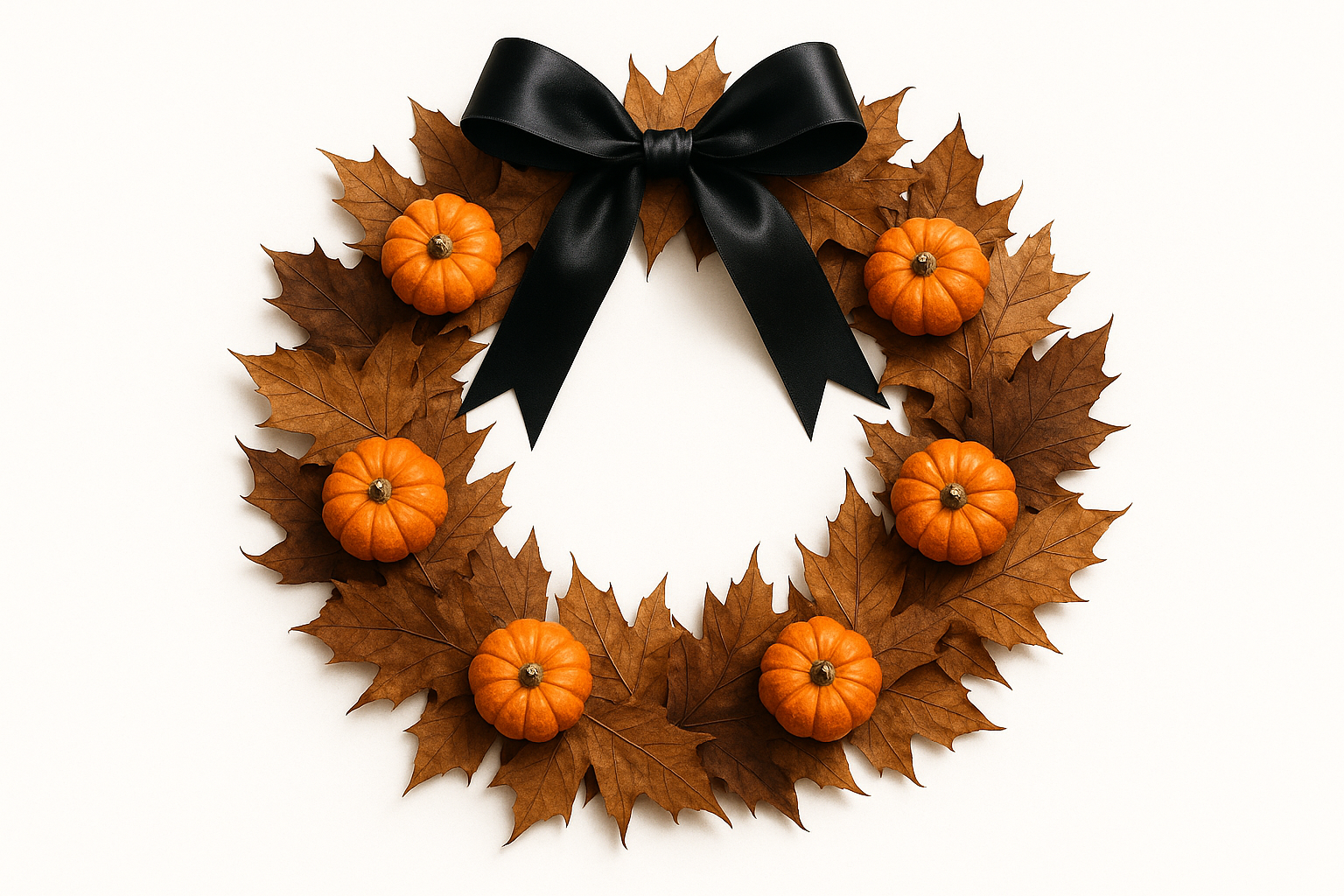 На изображении представлен осенний венок, выполненный из сухих коричневых листьев, которые расположены по кругу. Вокруг венка размещены маленькие ярко-оранжевые тыквы, создающие контраст с общей коричневой гаммой. В центре венка находится стильный черный бантик, который добавляет элегантности и стиля. Композиция находит себя на светлом фоне, что позволяет всем элементам выделяться и привлекать внимание. Этот венок отлично подойдет для украшения интерьера в осенний сезон или на праздник Хэллоуин.