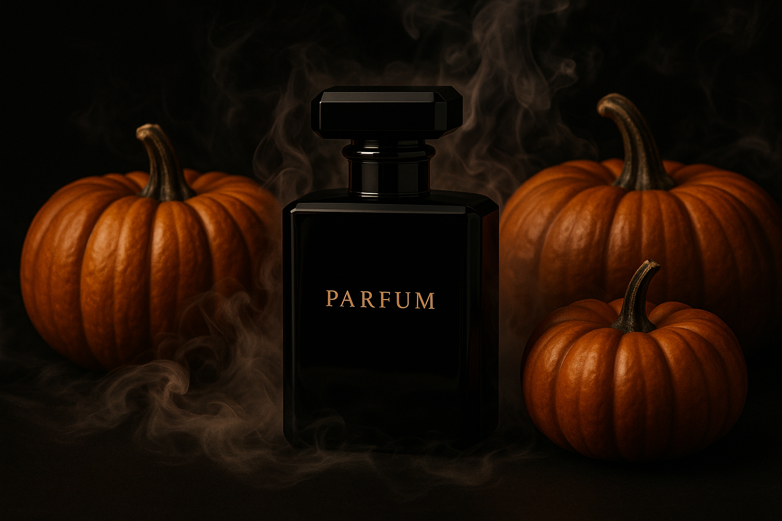 На изображении представлен элегантный черный флакон парфюма, расположенный на неверном фоне. Элементами композиции выступают несколько тыкв, окрашенных в насыщенные оранжевые тона, которые окружают флакон, создавая эффектный контраст. Туманные завитки дымка подчеркивают таинственность и элегантность всей сцены. Флакон акцентирован, с золотыми буквами, где указано название 'PARFUM', что добавляет нотку роскоши. Фон темный, что дополнительно усиливает заразительность и загадочность изображения.