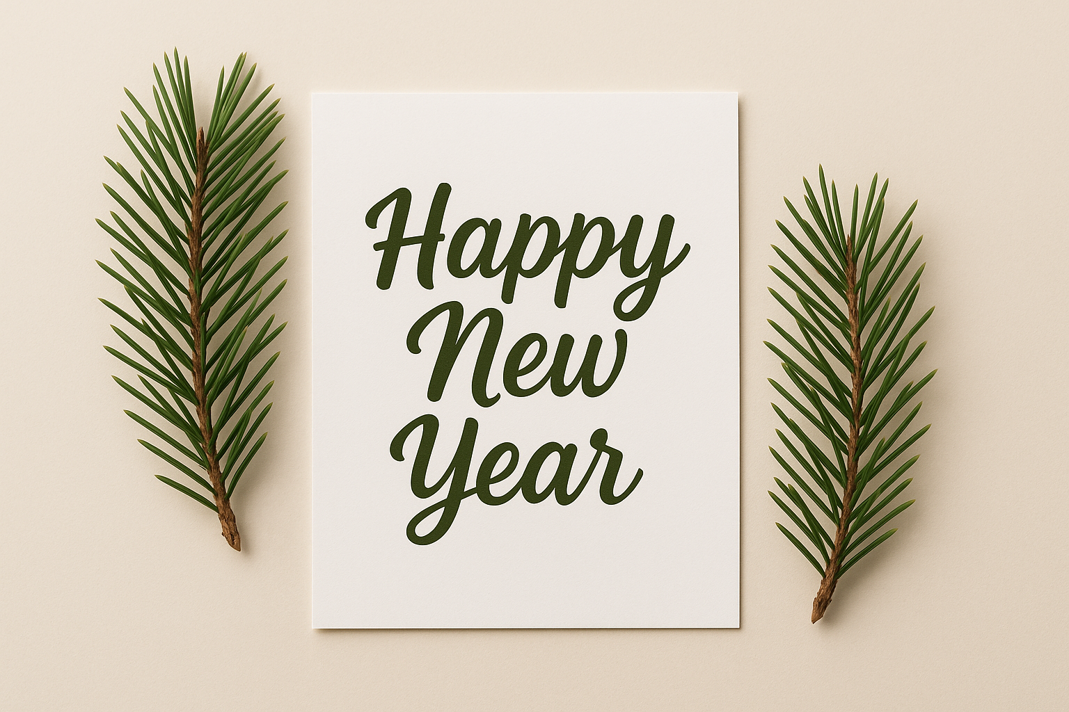 На изображении представлена новогодняя открытка, на которой яркими буквами написано 'Happy New Year'. Открытка расположена на светлом фоне, что создает теплую и праздничную атмосферу. С обеих сторон открытки расположены свежие еловые ветки, которые подчеркивают новогоднюю тематику и добавляют элемент природы. Открытка выполнена в классическом стиле, а шрифт букв выглядит изысканно и стильно. Этот элемент дизайна отлично подходит для поздравлений, оформления интерьера или создания праздничного настроения в доме.