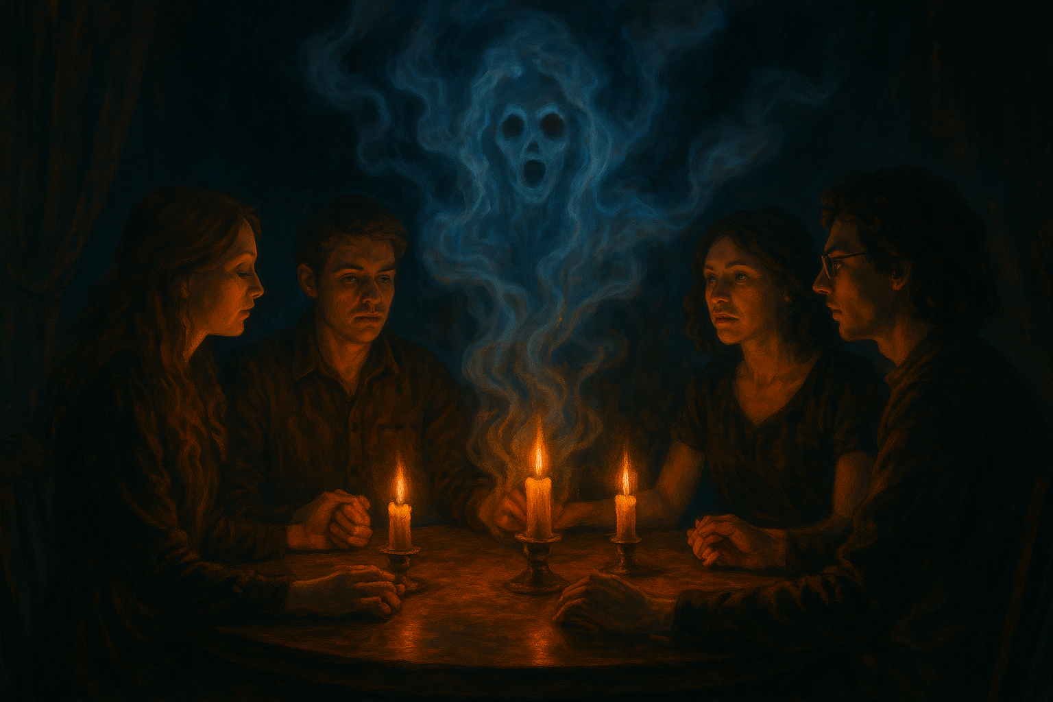 На изображении запечатлен момент сеанса спиритизма, проходящего в полумраке. Четыре человека сидят вокруг стола, в центре которого горят три свечи, создавая таинственную атмосферу.