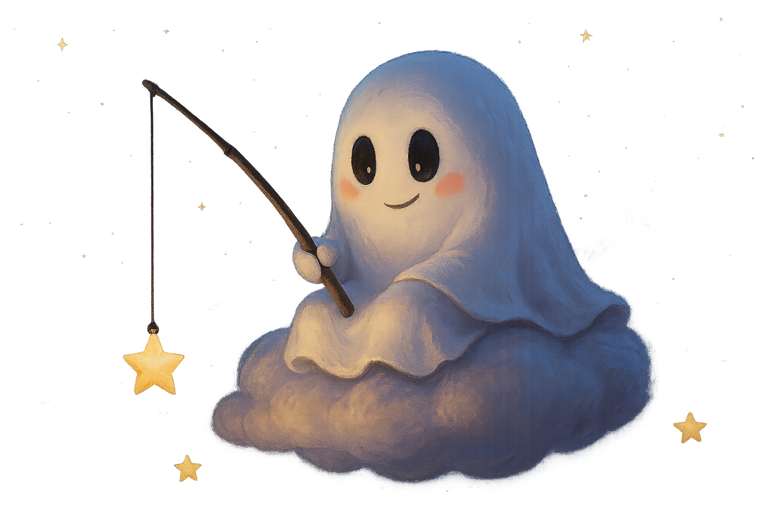 На изображении представлен забавный призрак, сидящий на облаке и ловящий звёзды с помощью удочки. Призрак изображён с большими круглыми глазами и милой улыбкой, что придаёт нему добрый и дружелюбный вид. Он окутан белым покрывалом, что придаёт нему характерный вид призрака, а розовые щёчки добавляют нотку игривости. Облако выглядит пушистым и мягким, как будто оно сделано из ваты. Из-за этого призрак кажется уютным и безобидным. Вокруг изображены несколько звёзд, которые сверкают на фоне тёмного ночного неба, создавая атмосферу волшебства и уюта.