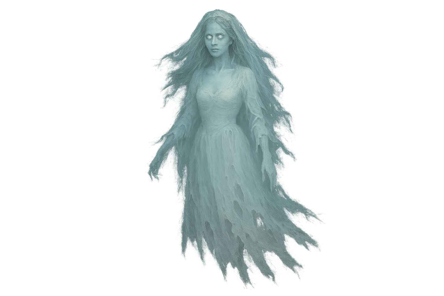 На изображении представлен призрак женщины, облаченной в белое платье, с длинными светлыми волосами, плавно обрамляющими её лицо. Её тело полупрозрачное, что создает ощущение легкости и эфемерности. Грудь и плечи открыты, а руки, кажется, тянутся вперед. Силуэт призрака имеет слегка расплывчатые края, что добавляет загадочности её образу. Светлый фон подчеркивает голубоватые оттенки её платья и кожного покрова, а также создает контраст с более темными цветами вокруг. Глаза призрака белые и лишены зрачков, что может лишить её образ жизненности, но одновременно придаёт ему необычную притягательность. В целом, изображение вызывает чувство неопределенности и мистики, оставаясь в рамках классического образа призрака.