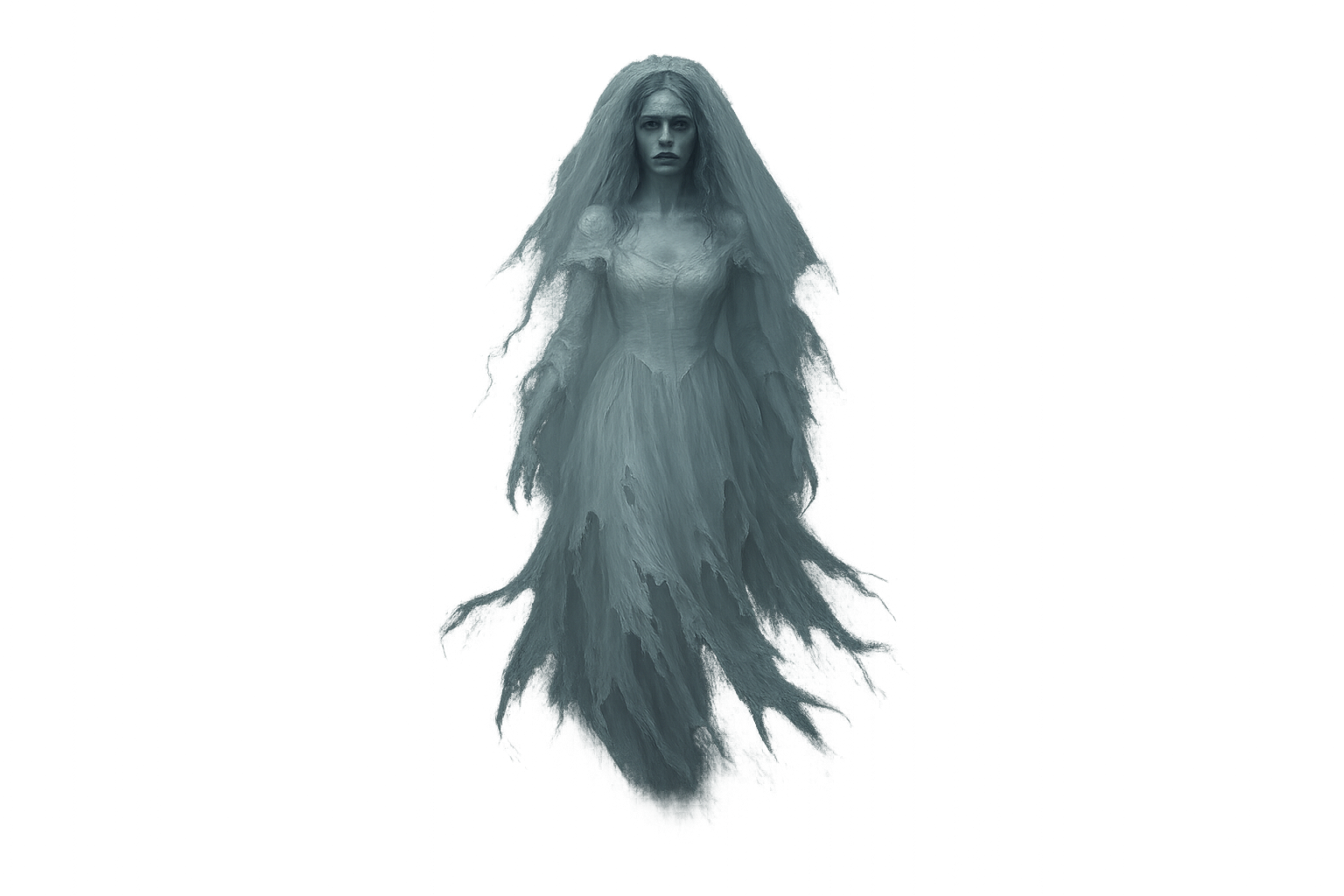 На изображении представлена фигура призрака, одетого в свадебное платье, которая нависает на черном фоне. Образ выполнен в холодных тонах, создавая контраст между светлым платьем и темным окружением. Ветви или рюши платья выглядят почти как облака или призраки, придавая фигуре воздух и легкость. Лицо призрака имеет серьезное выражение, что добавляет загадочности и интриги к визуальному образу. Чувствуется ощущение, что призрак парит в воздухе, что создает атмосферу мистики.