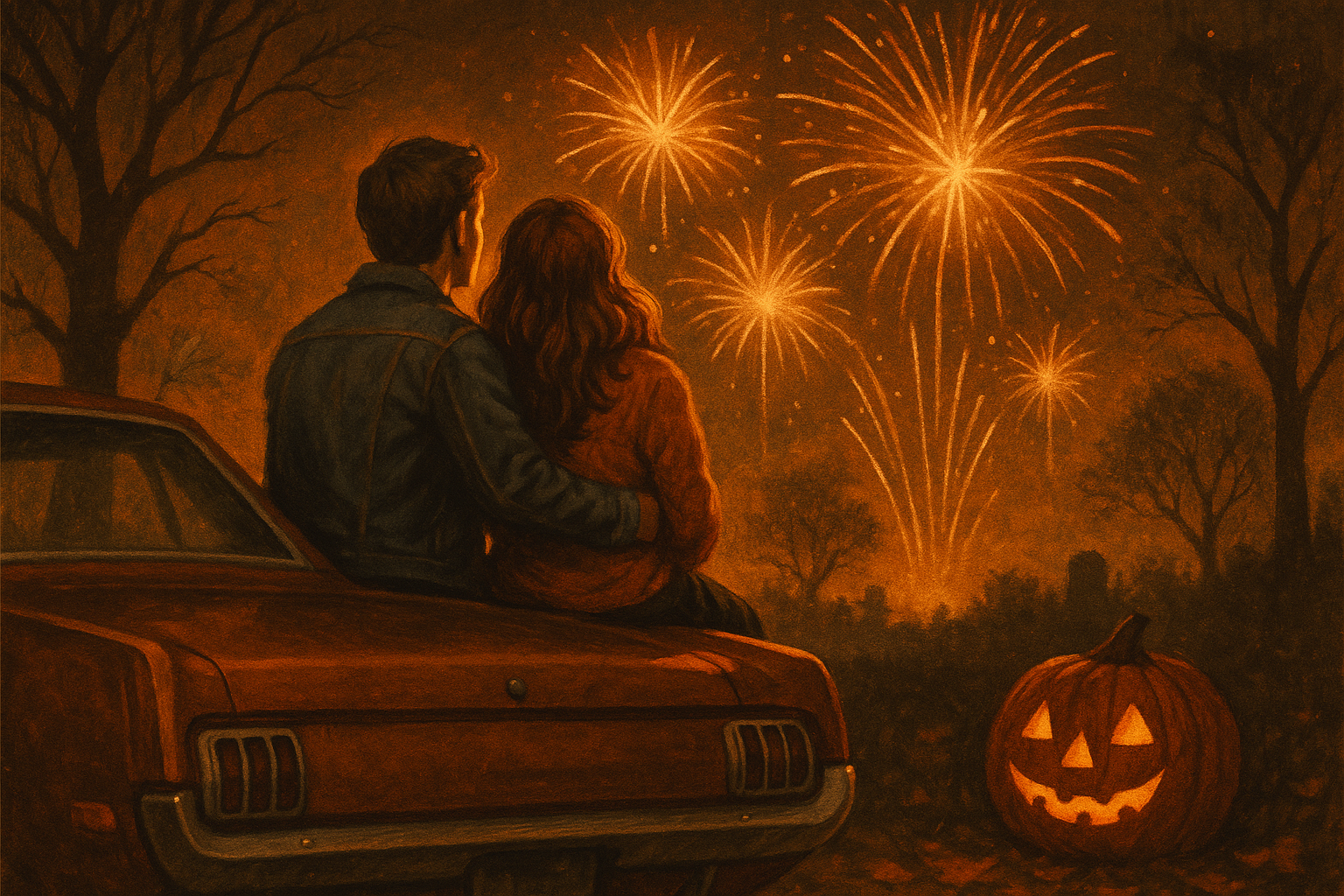На изображении представлена романтическая сцена, где молодая пара сидит на капоте красного автомобиля, обнявшись. Позади них открывается живописный вид на небо, озаренное яркими фейерверками, которые заполняют ночное пространство огненными цветами. Эти фейерверки создают атмосферу праздника и восхищения, в то время как пара погружена в свои мысли. Вдалеке видны силуэты деревьев и кладбища, добавляющие налет таинственности к сцене. Справа от пары расположена тыква с улыбающимся лицом, что отлично вписывается в атмосферу Хэллоуина. Эта картина передает чувство тепла и уюта между влюбленными под сиянием фейерверков.