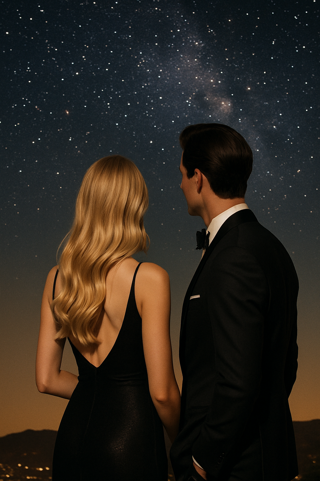 На изображении показана элегантная пара, стоящая спиной к зрителю, на фоне великолепного звездного неба. Женщина носит черное вечернее платье с откровенной спиной, а мужчина одет в классический смокинг. Их позы передают атмосферу романтики и умиротворения, создавая настроение ожидания и волшебства. Ночное небо заполнено множеством ярких звёзд, а Млечный Путь плавно пересекает верхнюю часть изображения. Сцена выглядит как идеальное место для романтического свидания или вечернего отдыха вдали от городской суеты, придавая ей сказочный оттенок.