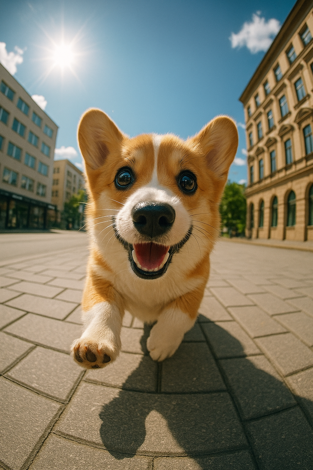 На изображении изображен корги, который бежит по улице. Солнечный день, яркое голубое небо, и его радостное выражение лица создают атмосферу счастья и энергии. Вокруг него видно несколько зданий, а на тротуаре отчетливо видны плитки, по которым собака движется вперед. Корги с выразительными большими глазами и округлыми ушами выглядит полным жизни и радости, подчеркивая свою дружелюбную натуру. Съемка выполнена с низкой точки, что позволяет зрителю взглянуть на корги в его естественной среде обитания.