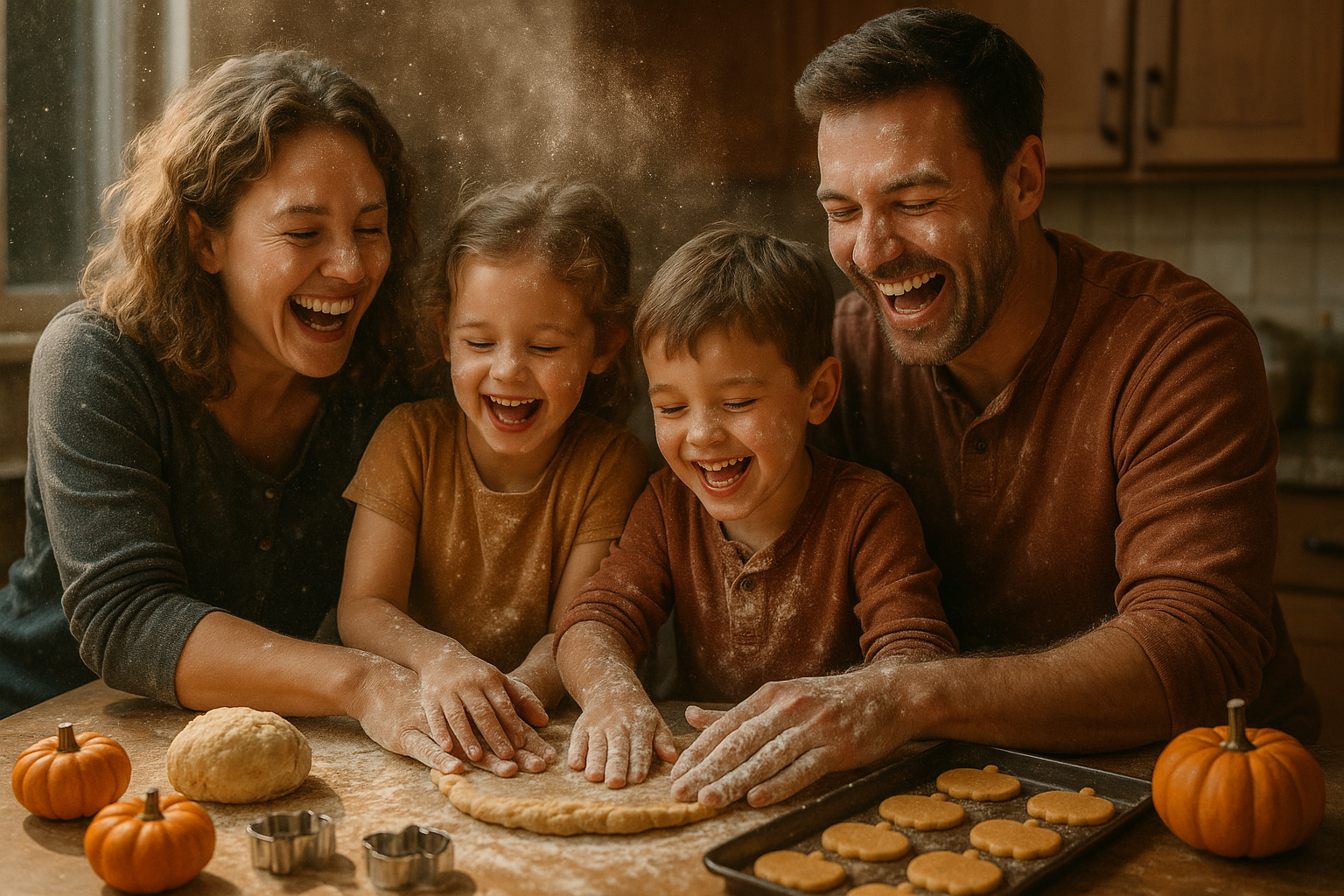 На изображении изображена счастливая семья, состоящая из четырёх человек, занимающаяся выпечкой на кухне. Их лица светятся от радости и счастья. Мама и папа сидят с детьми, обе девочки улыбаются, в то время как мальчик активно участвует в процессе. На столе расстелено тесто, и все члены семьи кладут свои руки на него, создавая атмосферу совместного творчества. Вокруг них разбросаны маленькие тыквы и формочки для печенья. Мягкий свет за окном придаёт сцене уюта и тепла, подчеркивая важность семейных традиций и радости совместной деятельности.