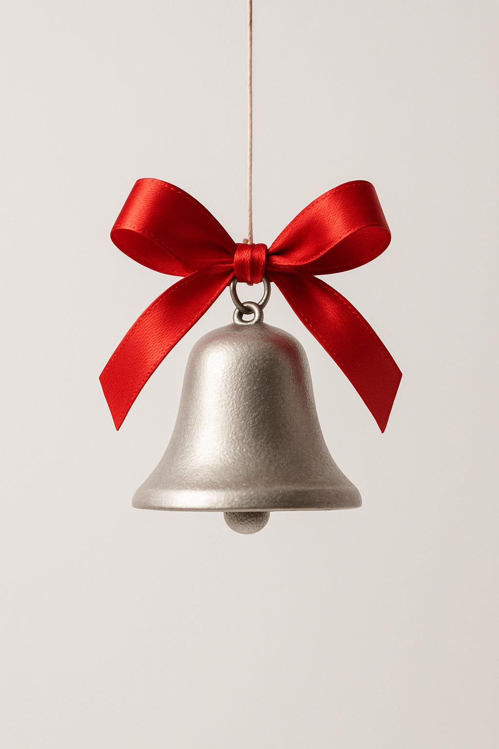 На изображении представлен серебряный колокол, который висит на тонкой веревке. Колокол имеет гладкую, блестящую поверхность, что придает ему элегантный вид. Украшение колокола включает большой, ярко-красный атласный бантик, завязанный в центре, который контрастирует с холодным оттенком металла. Фон изображения выполнен в нейтральном светлом цвете, что позволяет сосредоточиться на самом предмете. Колокол символизирует радость и торжество, а бантик добавляет элемент праздника и украшения.