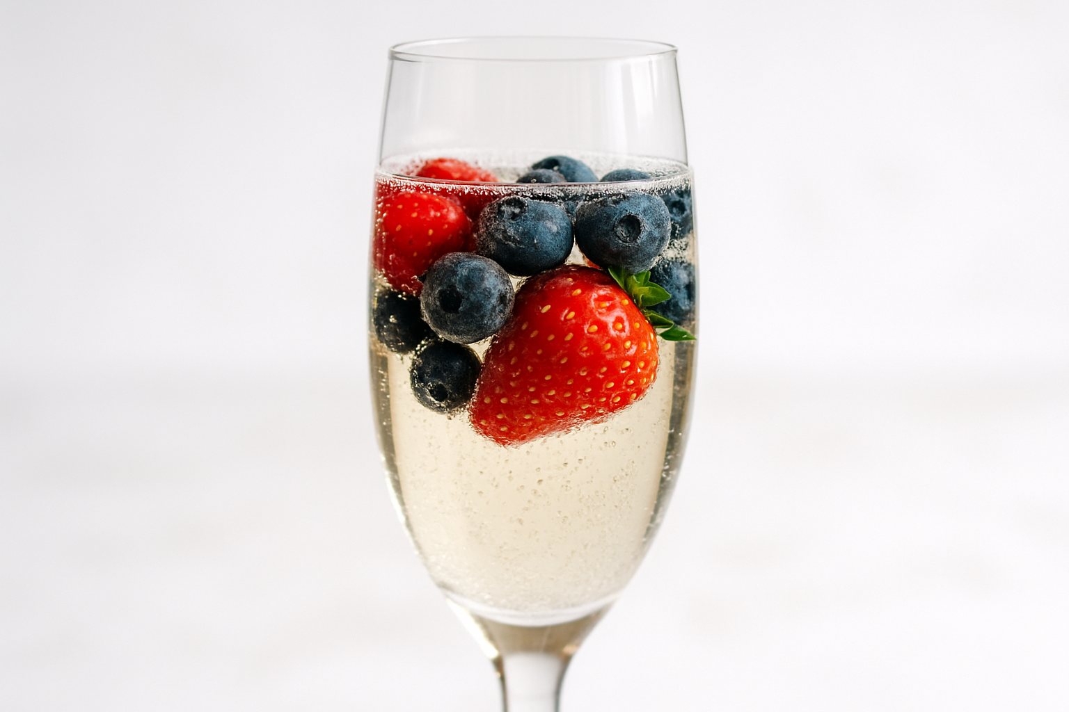 На изображении показан стеклянный бокал, наполненный шампанским, где плавают свежие ягоды. В бокале видно крупные клубники и голубики, которые придают напитку яркий и аппетитный вид. Бокал стоит на светлом фоне, подчеркивающем прозрачность жидкости и свежесть ягод. Сочетание пузырьков газа в шампанском и ярких цветов ягод создает эффект праздничного настроения.