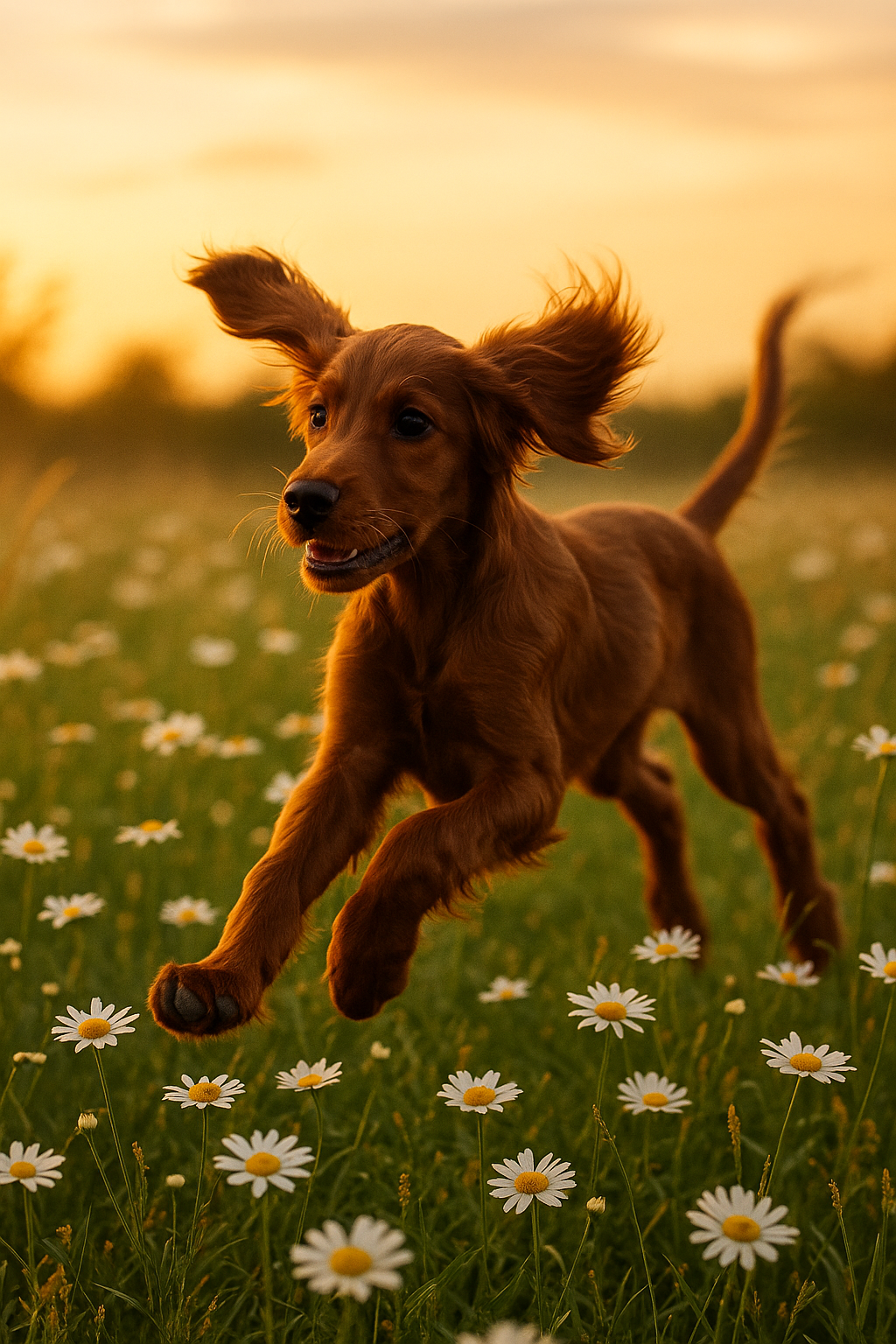 На изображении изображён щенок золотистого ретривера, который весело бегает по цветущему полноценному зелёному полю, покрытому ромашками. Его длинные уши трепещут на ветру, а густая шерсть сверкает в лучах заката. Солнце, находящееся на горизонте, окрашивает небо в тёплые оранжевые и жёлтые оттенки, создавая уютную обстановку. Вокруг растут белоснежные ромашки, которые добавляют яркости и контраста к изображению.