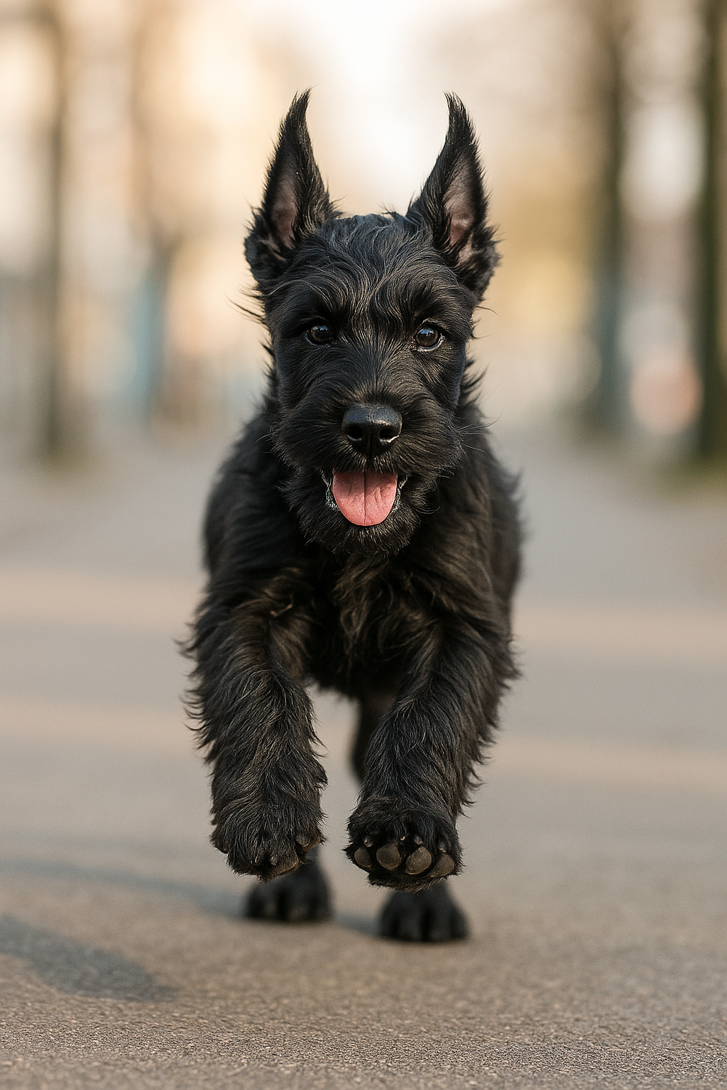 На изображении находится маленький черный щенок, который бежит по городской улице. У щенка торчат большие уши, он выглядит игривым и любопытным. Его шерсть густая и мягкая, а глаза блестят от восторга. Фон размыт, что создает эффект движения и подчеркивает живость щенка. Асимметричные линии его тела направляют взгляд зрителя к его лицу, что делает образ выразительным и привлекательным.