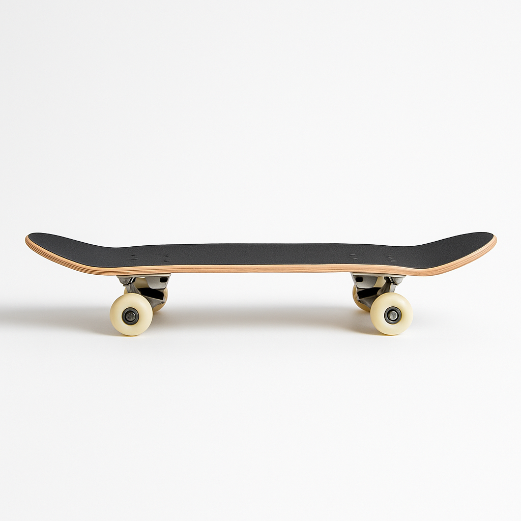 На изображении представлен скейтборд, выполненный с акцентом на минимализм и функциональность. Дека скейтборда имеет черное покрытие с текстурой шершавого материала, обеспечивающего надежное сцепление ног с доской. Колеса скейтборда выполнены в светлом цвете, что создает контраст с темным покрытием деки. Доска имеет плавные линии и изогнутые края, что делает ее удобной в использовании. Скейтборд установлен на нейтральном белом фоне, что подчеркивает его дизайн и детали. Фотография демонстрирует скейтборд, который подходит как для новичков, так и для опытных скейтбордистов, благодаря своей простоте и стилю.