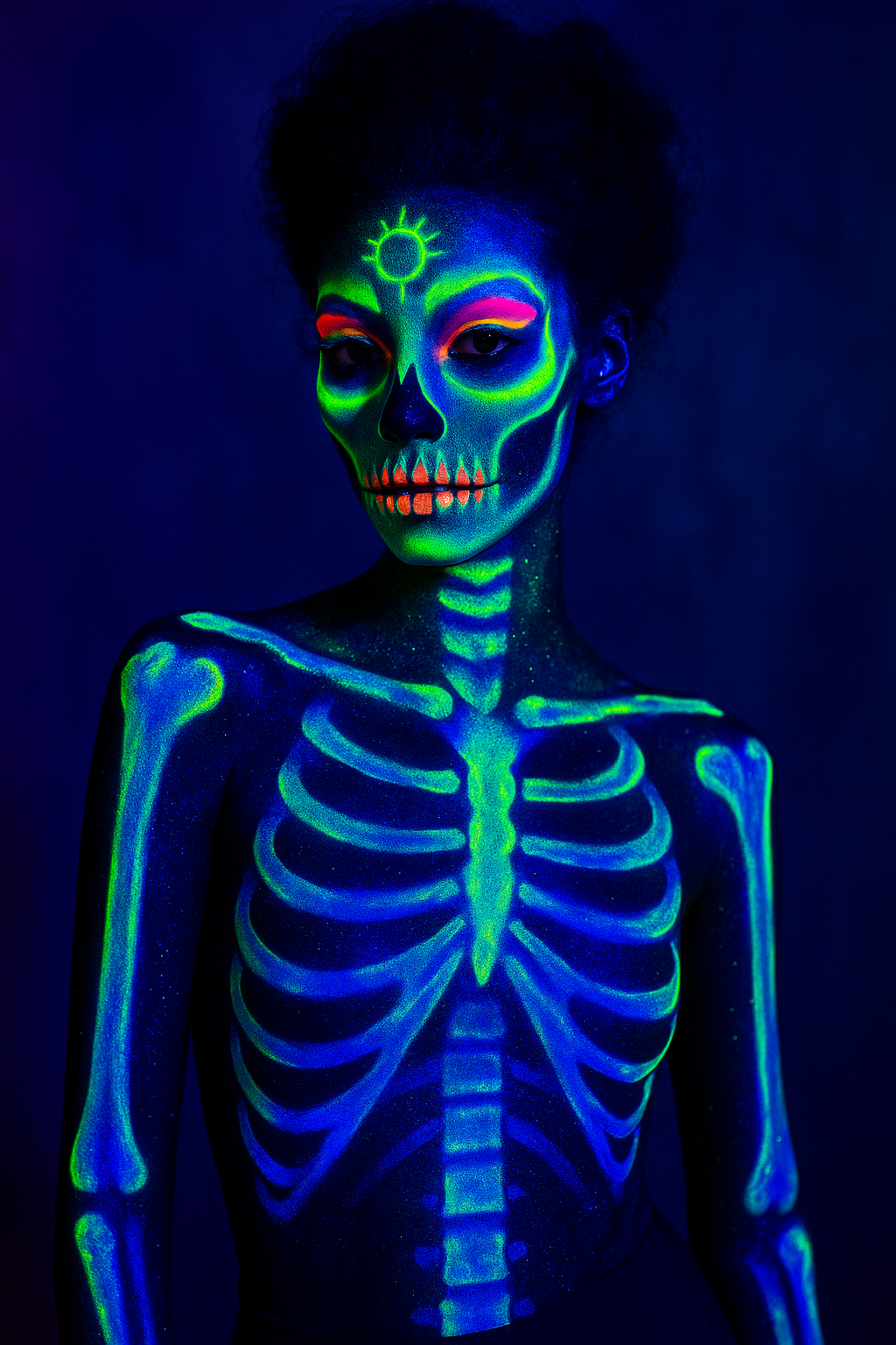 На изображении представлена женщина, окрашенная в неоновые цвета. Ее тело украшено художественным рисунком, изображающим человеческий скелет. Рисунок выполнен с использованием ярких флуоресцентных оттенков, что придает ему особую выразительность, особенно в темном окружении. Лицо модели также раскрашено, создавая единую композицию с телом. Яркие акценты на глазах и губах добавляют игривости и поколения.