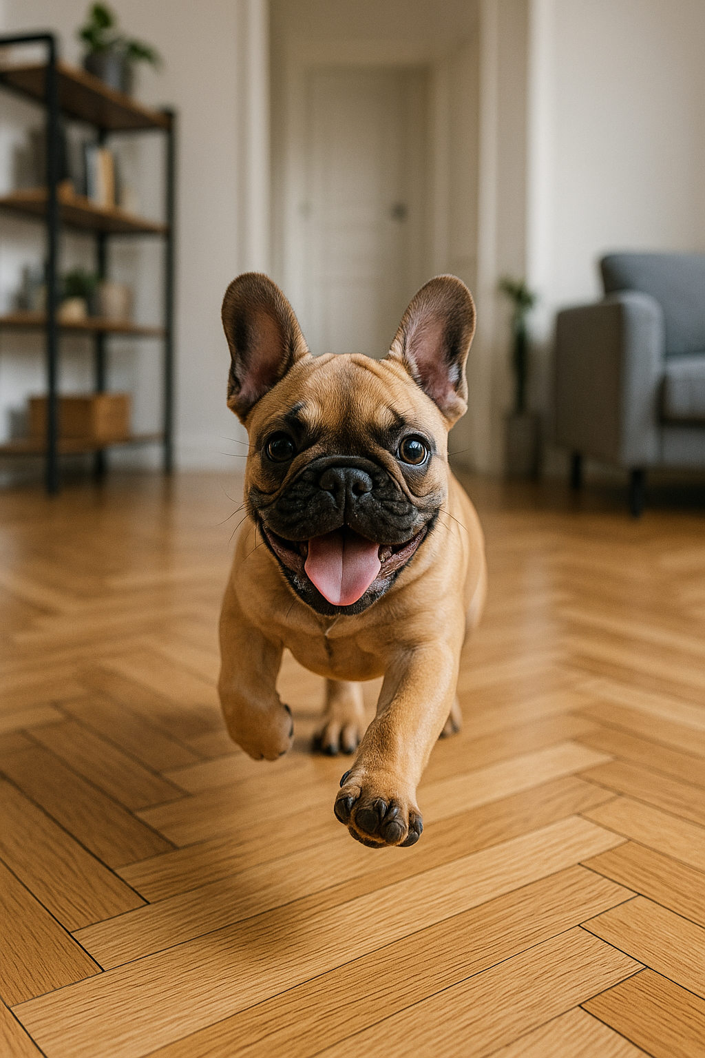 На изображении запечатлён щенок французского бульдога, который весело прыгает по деревянному полуквартиры. Щенок выглядит очень игриво, его яркие уши приподняты, а язык высунут в улыбке. Просторная комната оформлена в минималистичном стиле: на заднем фоне виден стеллаж с книгами и небольшими растениями, что создаёт уютную атмосферу. Светлый тон комнаты и панорамные окна делают её ещё более светлой и воздушной. Деревянный пол выполнен в тёплом оттенке, добавляя уюта на фоне игривого щенка.