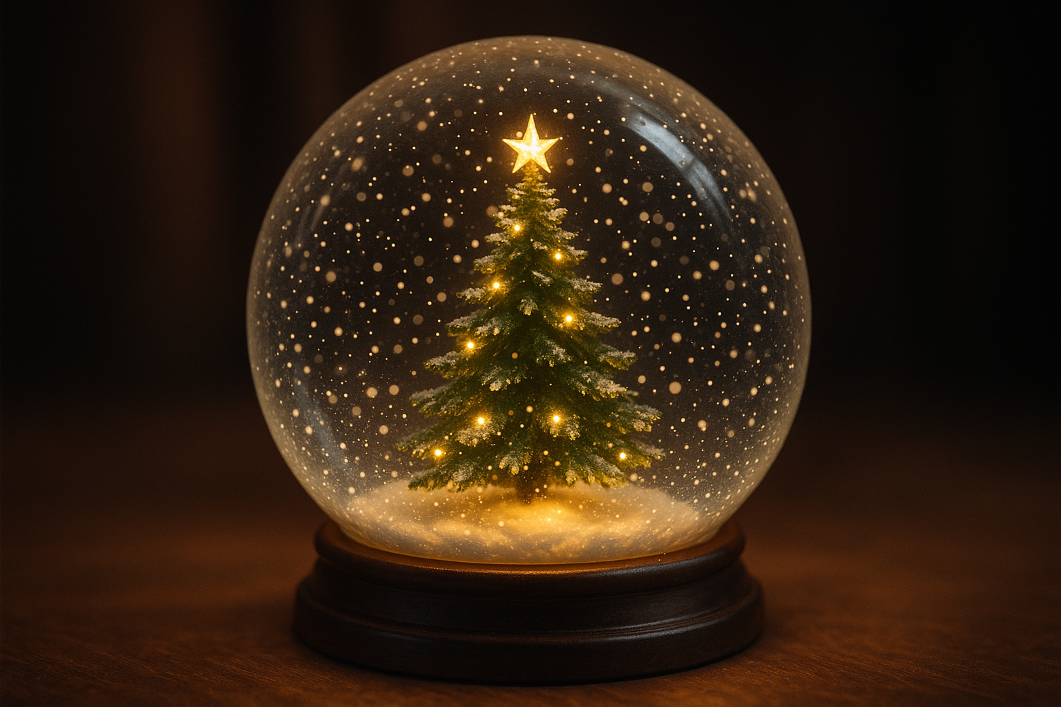На изображении изображен снежный шар, внутри которого находится детализированная рождественская елка. Елка украшена маленькими огоньками, которые создают теплый и уютный свет. Снежный шар окружен искусственным снегом, что добавляет атмосферу зимнего праздника. Фон изображения выполнен в темных тонах, что подчеркивает яркость огоньков и снежных частиц, медленно падающих внутри шара. Эта композиция создает волшебное настроение, идеально подходящее для зимних праздников и новогодних торжеств.