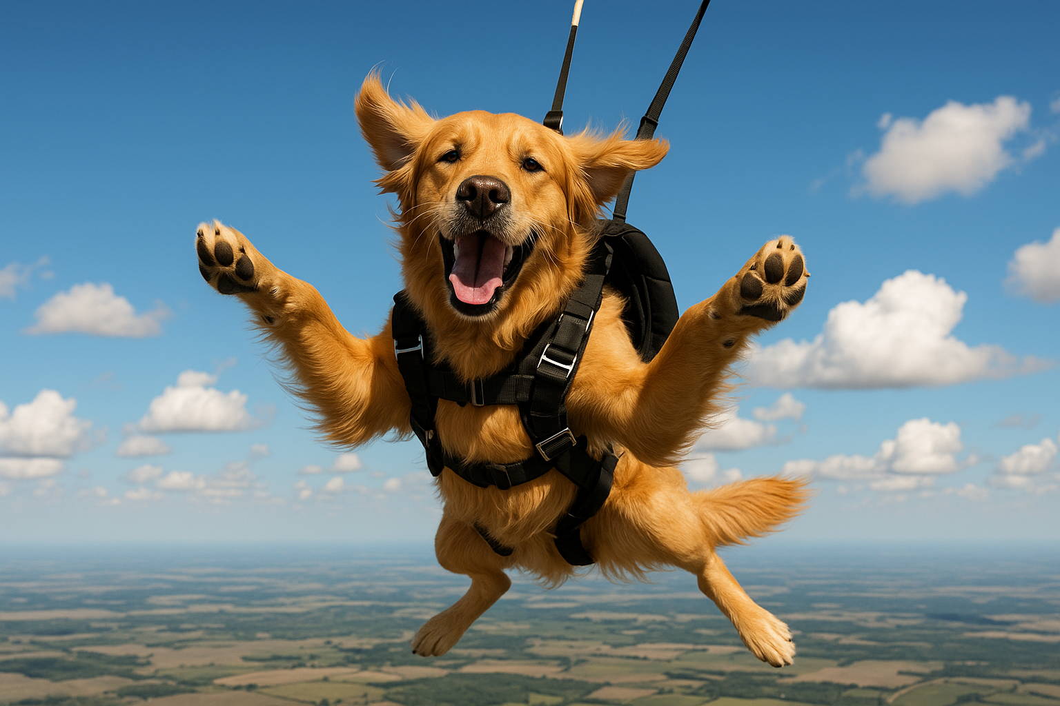 На изображении можно увидеть золотистого ретривера, который с восторгом парит в небе, крепко удерживаемый за специальный рюкзак. Он находится на высоте, окруженный ярким голубым небом и белыми облаками, которые создают контраст с его теплым мехом. На заднем плане виднеются зеленые поля, добавляющие природного обаяния и спокойствия в общую картину. Позиция собаки и её выражение вполне охарактеризуют радость и облегчение, что создает атмосферу беззаботности и свободы.