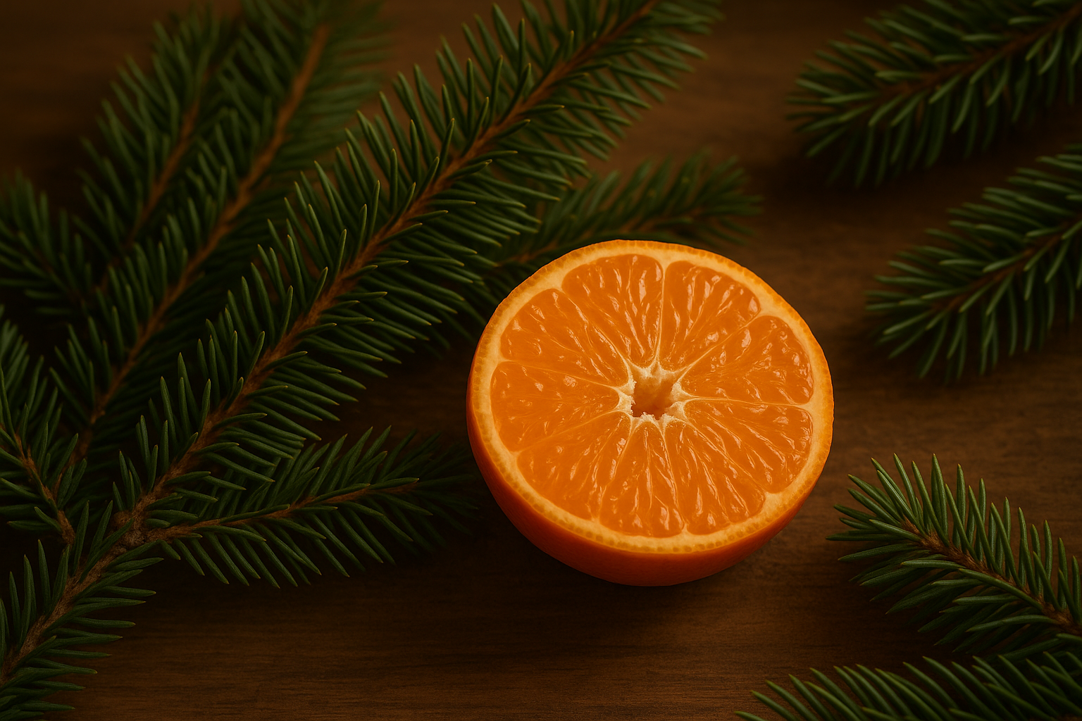 На изображении представлена разрезанная пополам мандарина, яркий и сочный, который расположен на деревянной поверхности. Мандарины известны своим сладким вкусом и ярким оранжевым цветом. Вокруг фрукта расположены зелёные хвойные ветки, что создает контраст между оранжевым и зелёным цветами. Это создает атмосферу уюта и свежести, подчеркивает естественную красоту как самого фрукта, так и природных элементов вокруг него.