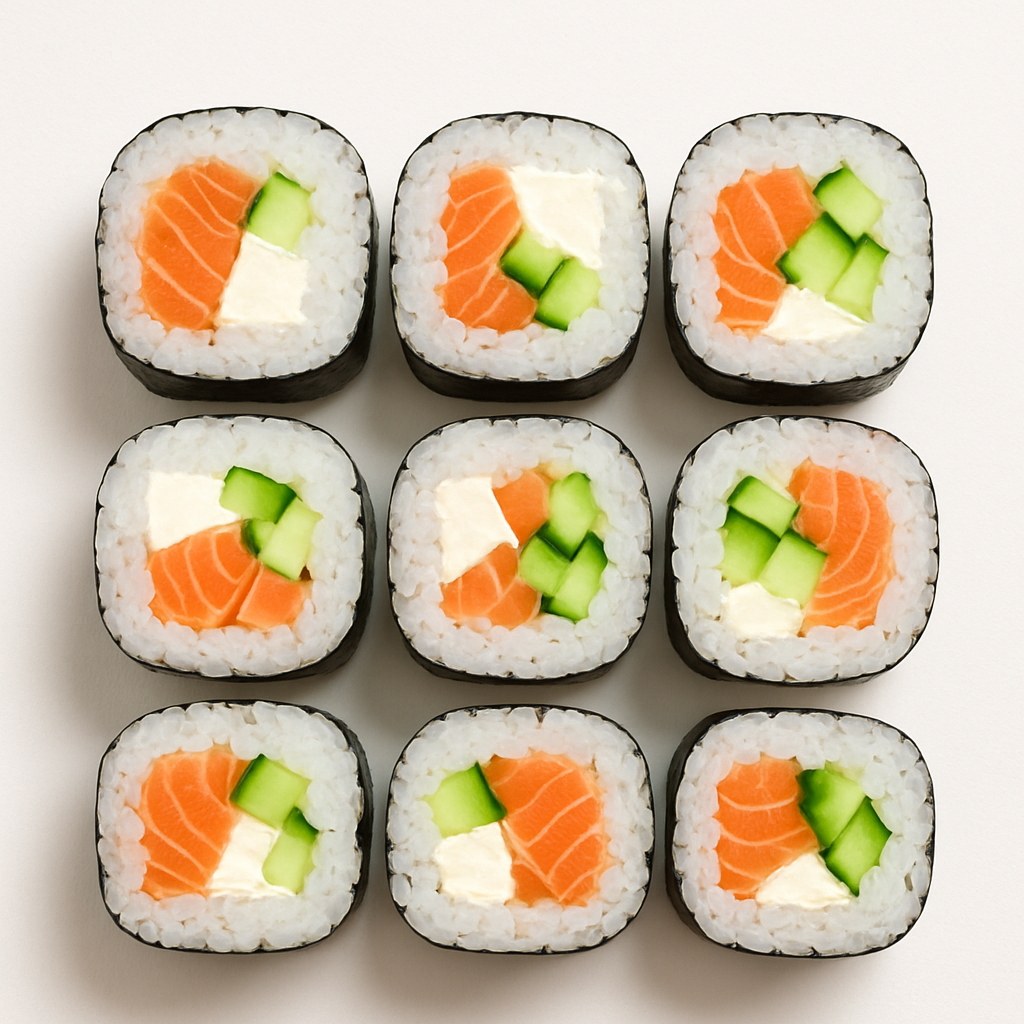 На изображении представлены девять квадратных роллов, выложенных на светлом фоне. Каждый ролл содержит свежую рыбу лосось, огурец и сливочный сыр, завернутые в спрессованный рис и нори. Цветовая палитра роллов состоит из оттенков светлого и темного, создавая приятный визуальный контраст. Лосось выделяется оранжевым цветом, а огурец и сыр добавляют яркие зеленые и белые элементы, делая блюдо не только вкусным, но и привлекательным для глаза. Эта композиция роллов по размеру и форме идеально подходит для подачи на стол для друзей или на мероприятиях, связанных с японской кухней.