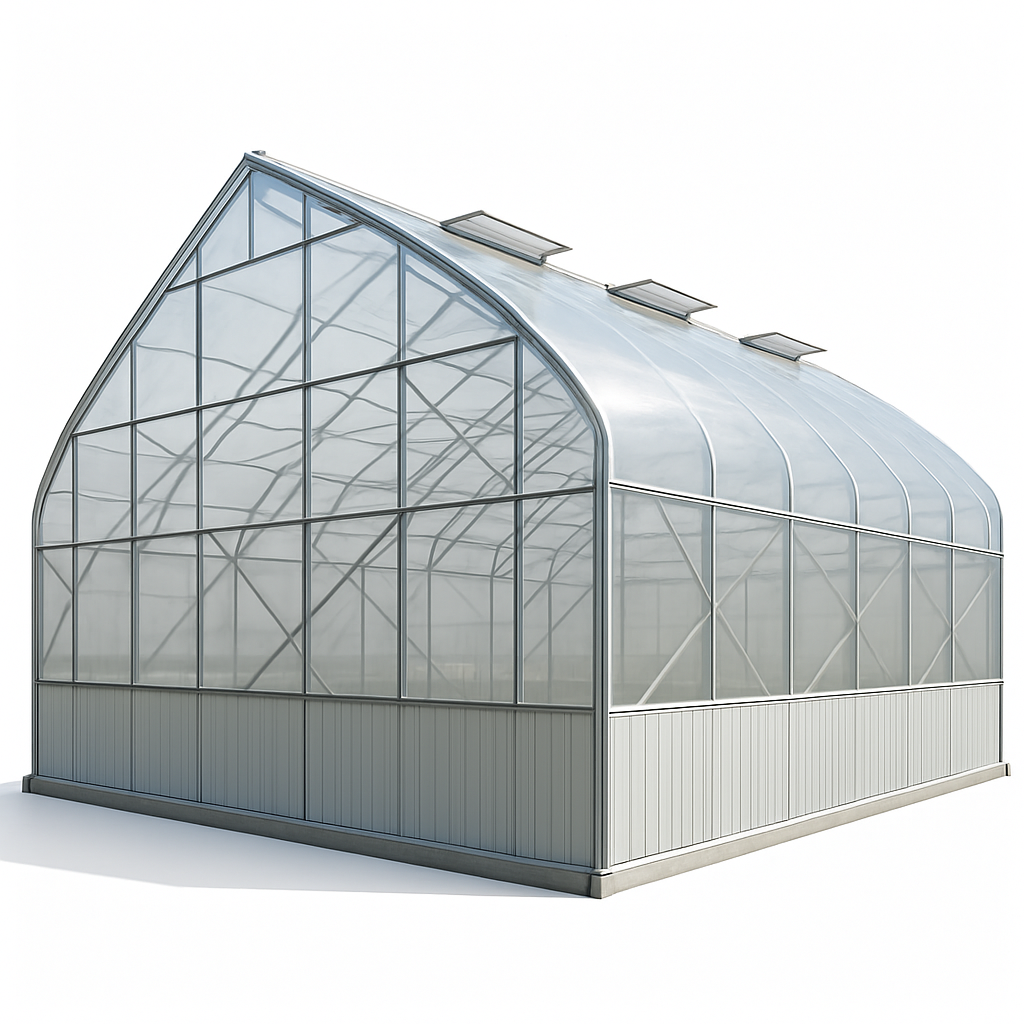 Описание: На изображении представлена современная теплица с металлической конструкцией и прозрачными стенами. Она имеет арочную форму и отлично подходит для выращивания растений в закрытом помещении. Теплица оборудована вентиляционными окнами на крыше, что позволяет улучшать циркуляцию воздуха и контролировать климат внутри. Стены сооружения выполнены из стеклянных панелей, что обеспечивает максимальное проникновение солнечного света.
