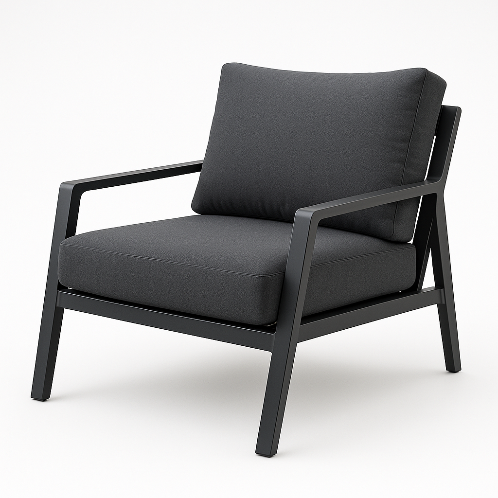 Кресло обладает простыми, но элегантными линиями, что позволяет ему гармонично вписаться в различные стили оформления — от минимализма до лофта. Чёрный цвет рамки и нейтральные оттенки подушек делают его универсальным решением для любого пространства.