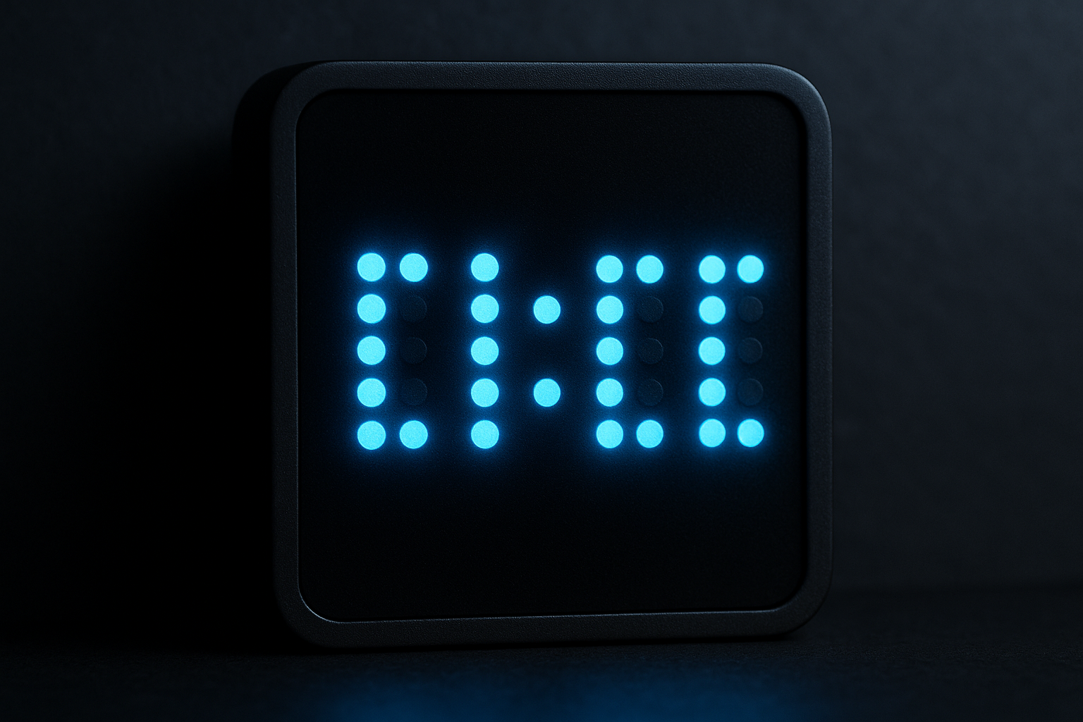 На изображении представлены современные цифровые часы, отображающие время с помощью светодиодов ярко-голубого цвета. Они имеют квадратный черный корпус, который контрастирует с ярким светом дисплея. Синяя подсветка создаёт технологичный и стильный вид, подходящий для разных интерьеров. Часы четко показывают время в формате «ЧЧ:ММ» с помощью точек, что делает их легко читаемыми даже в темноте. Эти часы подчеркивают минималистичный и современный стиль, с акцентом на функциональность и удобство использования.