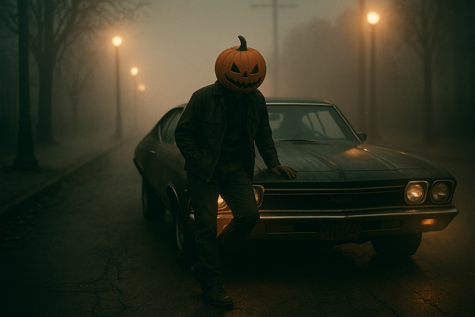 На изображении показан человек, стоящий рядом с классическим автомобилем на пустынной дороге. У человека на голове тыква с вырезанными лицом, что придает ему зловещий вид. Темнота и туман создают таинственную атмосферу. Уличные фонари излучают приглушенный свет, усиливая загадочное ощущение картинки. Вдали видны деревья, которые едва различимы сквозь густой туман.