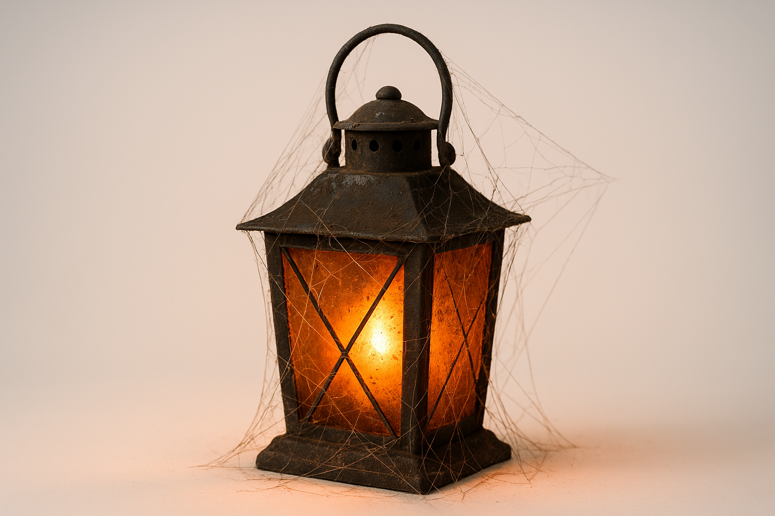 На изображении представлен старинный фонарь, выполненный из металла и украшенный стеклянными панелями. Его поверхность слегка потёртая, что добавляет ощущение возраста и истории. Изнутри фонарь светится теплым оранжевым светом, создавая уютную атмосферу. На стеклах видны следы пыли и паутина, что придаёт ему несколько заброшенный вид. Фонарь располагается на светлом фоне, что усиливает его визуальное воздействие.