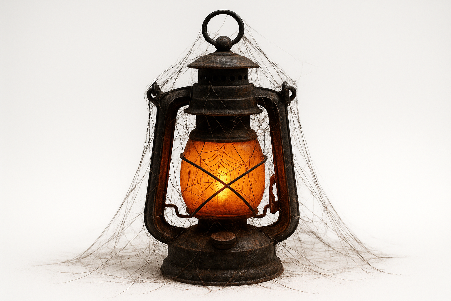 На изображении представлен старинный фонарь, выполненный в традиционном металлическом стиле. Его форма организована с округлой основной частью и декоративной верхней частью, которая завершена небольшим кольцом для подвешивания. Оранжевое стекло горловины фонаря излучает теплый свет, создавая атмосферу уюта. Особенностью данного фонаря является наличие паутины, которая обвивает его, что придает объекту вид запустения и забытости. Эта комбинация материалов и элементов формирует интересный визуальный контраст между старыми характеристиками и современным эстетическим взглядом.