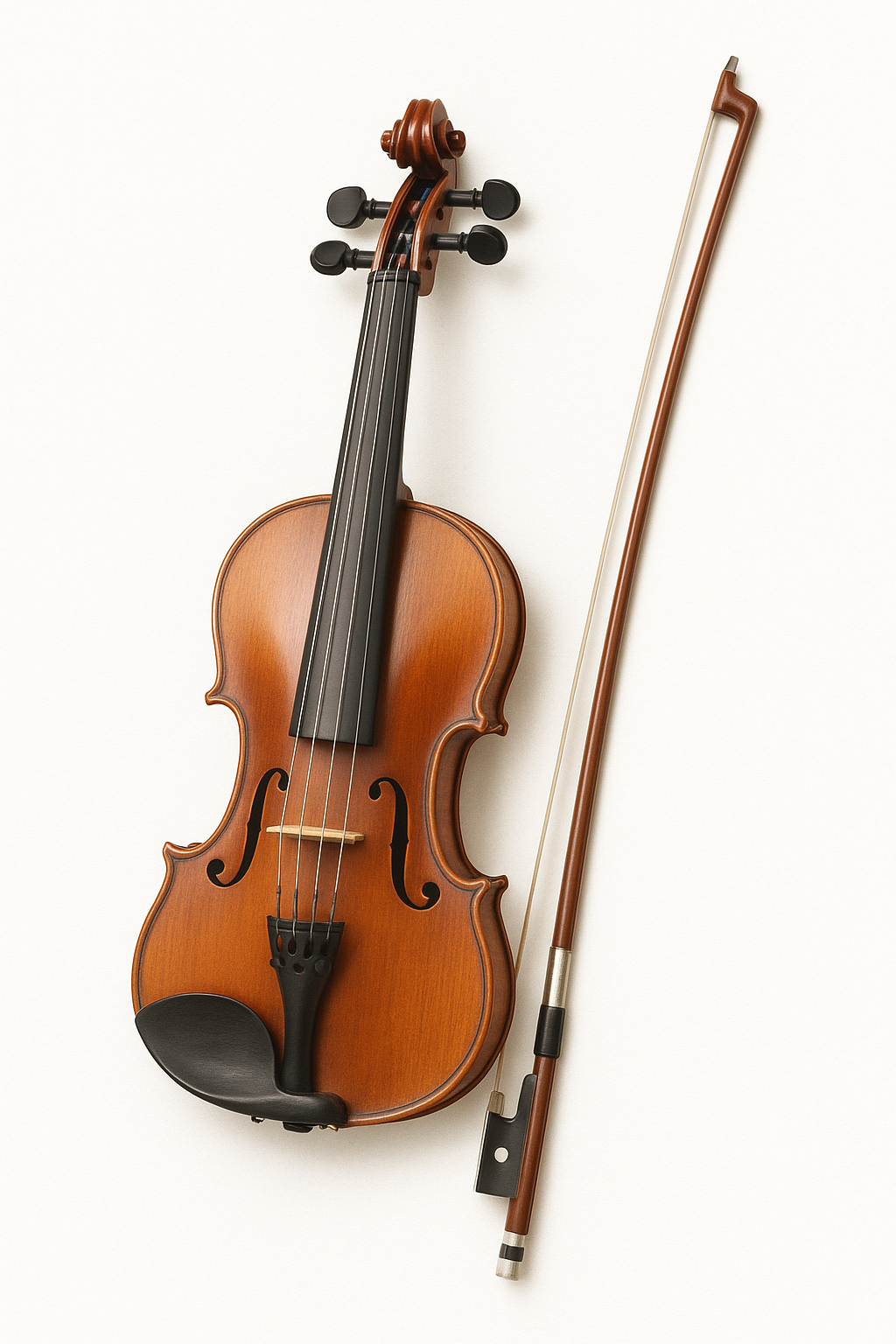 На изображении представлена классическая скрипка, выполненная из древесины с аккуратной полировкой. Скрипка расположена вертикально и занимает центральное место на светлом фоне, который подчеркивает ее текстуру и детали. К инструменту присоединен смычок, который также выполнен в теплых древесных тонах и имеет металлический элемент на конце. Скрипка обладает характерными чертами, такими как изогнутые формы, фрезеровка для создания звука и четыре струны, натянутые по всей длине. Это изображение эффективно демонстрирует не только красоту инструмента, но и его предназначение в классической музыке.