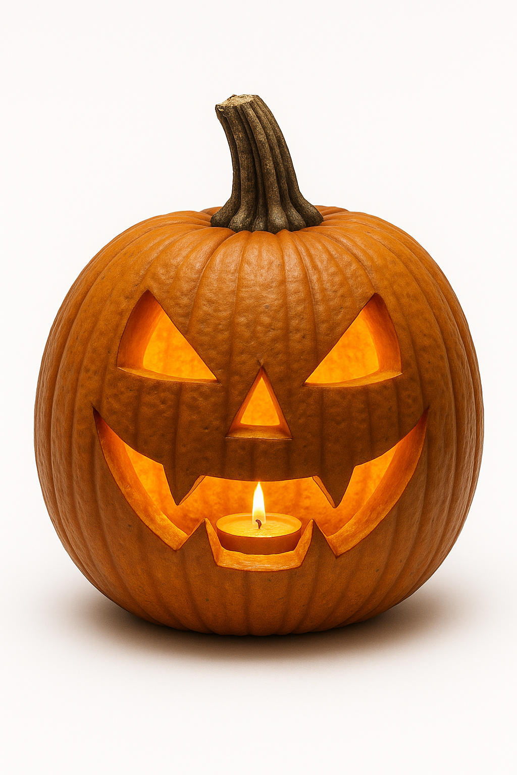 На изображении представлена большая тыква, вырезанная в форме фонаря для празднования Хэллоуина. Тыква окрашена в яркий оранжевый цвет и имеет характерную выпуклую форму. Лицо, вырезанное на тыкве, содержит большие глаза и улыбку, что придает ей жизнерадостный вид. Внутри тыквы находится маленькая свеча, чей теплый свет пропускается через вырезанные отверстия, создавая атмосферу уютности и таинства. Эти фонари традиционно используют в ночь Хэллоуина, чтобы отпугнуть злых духов и порадовать детей, которые приходят за угощениями. Сама тыква стоит на чистом белом фоне, что выделяет её выразительные детали и яркие цвета.