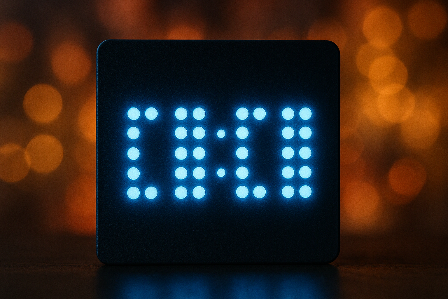 На изображении представлена светодиодная панель, на поверхности которой отображается текст «СН». Буквы выполнены с использованием точечных светодиодов, которые светятся ярким синим цветом. Фон, на котором установлена панель, размытый, с теплым оранжевым светоотражением, создающим уютную атмосферу. Данная панель имеет квадратную форму и демонстрирует ровные линии, гармонично сочетая технологичность и современный дизайн.