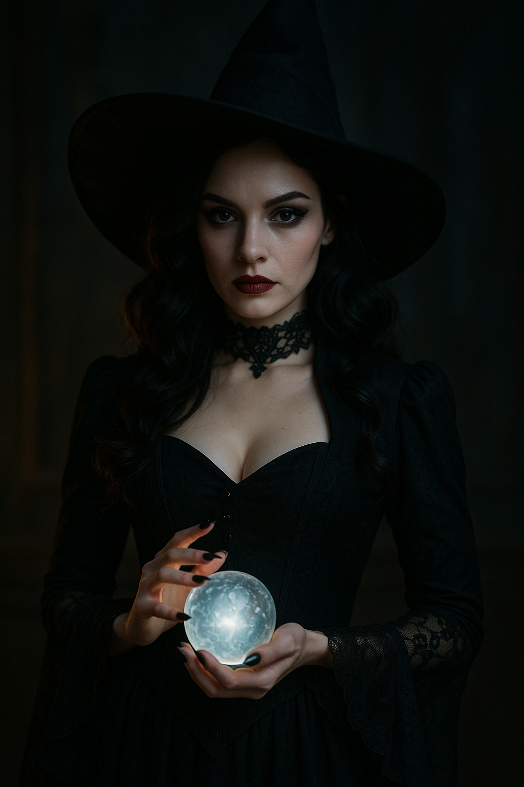 На изображении запечатлена загадочная женщина, одетая в черное платье в готическом стиле. Она носит широкую черную шляпу и колье, украшенное кружевами. В руках колдуньи находится светящаяся магическая сфера, излучающая мягкий свет. Фон изображения темный и загадочный, что подчеркивает ауру таинственности. Лицо женщины выражает сосредоточенность и уверенность, а яркие губы и выразительные глаза добавляют образу драматичности. Картинка создает атмосферу волшебства и интриги, заставляя зрителя задуматься о скрытых тайнах и магии.