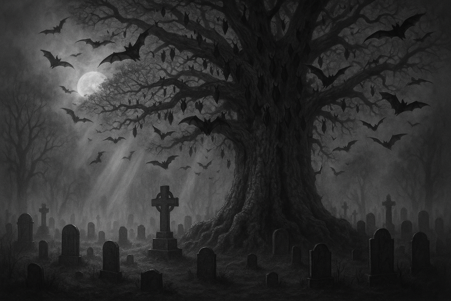 На изображении представлено мрачное и загадочное кладбище, окутанное туманом. В центре внимания находится массивное дерево с разветвленной кроной, над которым витают летучие мыши. Луна освещает сцену, создавая контраст между светом и темнотой. Вокруг видно множество надгробий, некоторые из которых украшены крестами. Атмосфера напоминает готический horror, создавая ощущение мистики и таинственности. Темные силуэты летучих мышей добавляют динамичности картине, а густой туман создает эффект глубины и неясности.